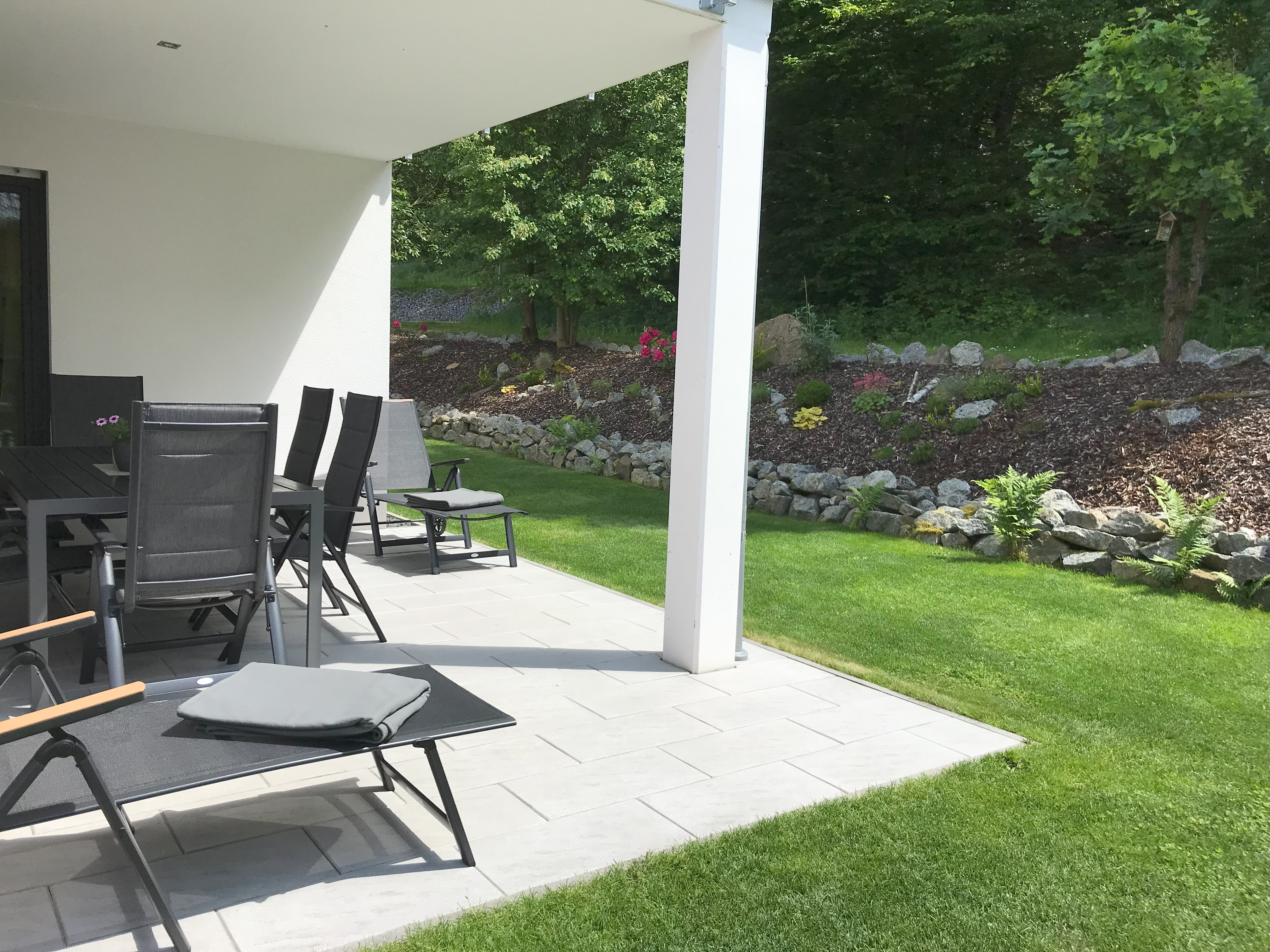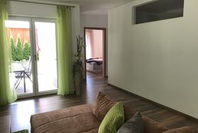 Das große Appartement befindet sich im Erdgeschoss mit Blick in den Wald. Auf der großen überdachten Terrasse mit Garten können Sie es sich gemütlich machen und den Ausblick in die Natur genießen.