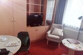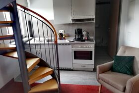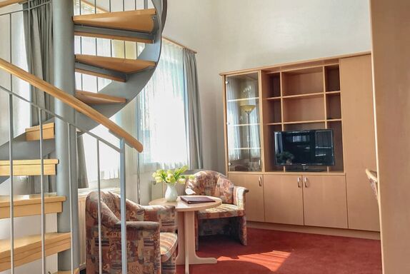 Wohnraum, Schlafgalerie in 2. Ebene mit Dachschräge und Einzelbett über Wendeltreppe erreichbar. Gemütliche Sitzecke mit SAT-TV, Radio, Telefon, sowie freies W-Lan. Das Zimmer verfügt über eine komplett ausgestattete Küche und Bad mit Dusche, WC und Föhn.