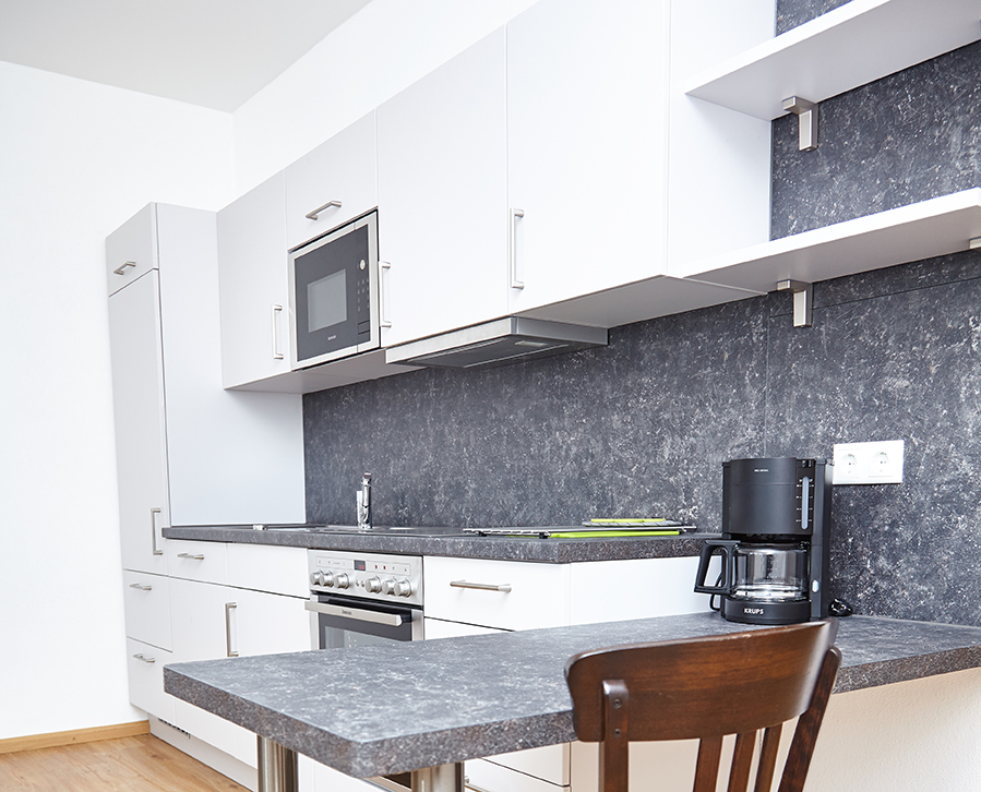 - Küchenzeile mit Herd, Mikrowelle, Kaffee-, Spülmaschine