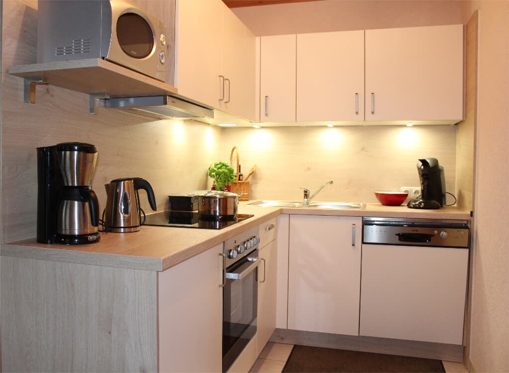 • sehr gut ausgestattete Küche Landhausküche mit Geschirrspüler, Mikrowelle, Cerankochfeld, Backofen, Gefrierfach, Wasserkocher, Filterkaffeemaschine, Toaster, Eierkocher, Kaffeevollautomat