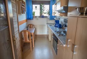 Die Wohnung bietet außerdem eine separate Küche mit integriertem Essbereich und ausreichend Abstellmöglichkeiten. Kühlschrank, Backofen, Mikrowelle, Kaffeemaschine, Wasserkocher, Spülmaschine, Toaster und Brotschneidemaschine sind vorhanden.