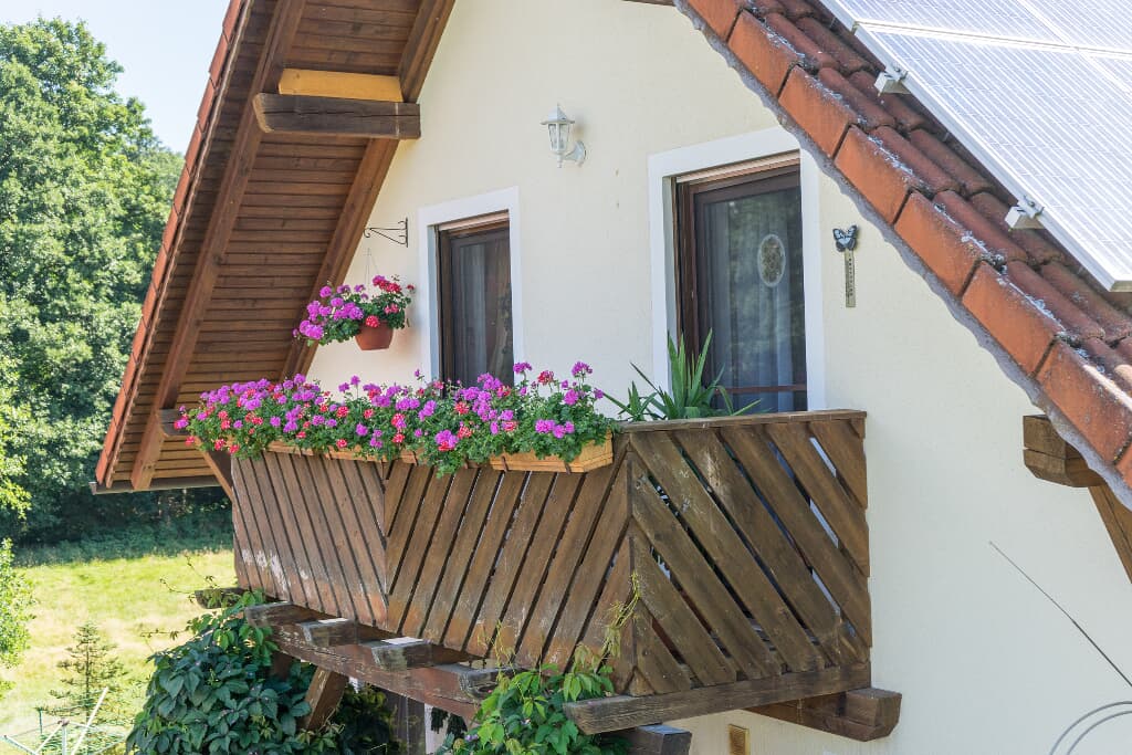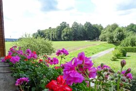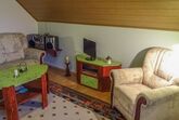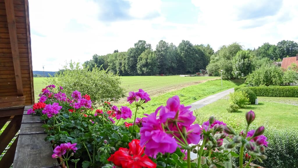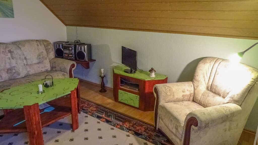 Über das komfortable Wohnzimmer, welches mit einem Flachbild-TV und einer Stereoanlage mit CD-Player ausgestattet ist, erreichen Sie den üppig bepflanzten Westbalkon. Von dort aus haben Sie Sicht auf den kleinen Ort Rothmühle und die umliegenden Wiesen und Wälder.