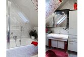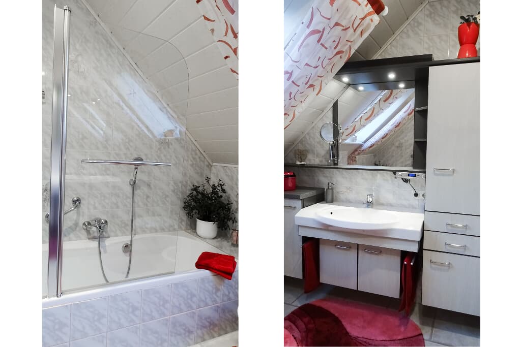 Das geräumige Badezimmer verfügt über eine Badewanne mit Duschmöglichkeit, ein Bidet und ein großes Dachfenster für viel Tageslicht. Handtücher werden selbstverständlich für Sie bereitgestellt. Je ein Bademantel in Gr. 40/42 und in Gr. 52/54 kann kostenlos ausgeliehen werden.