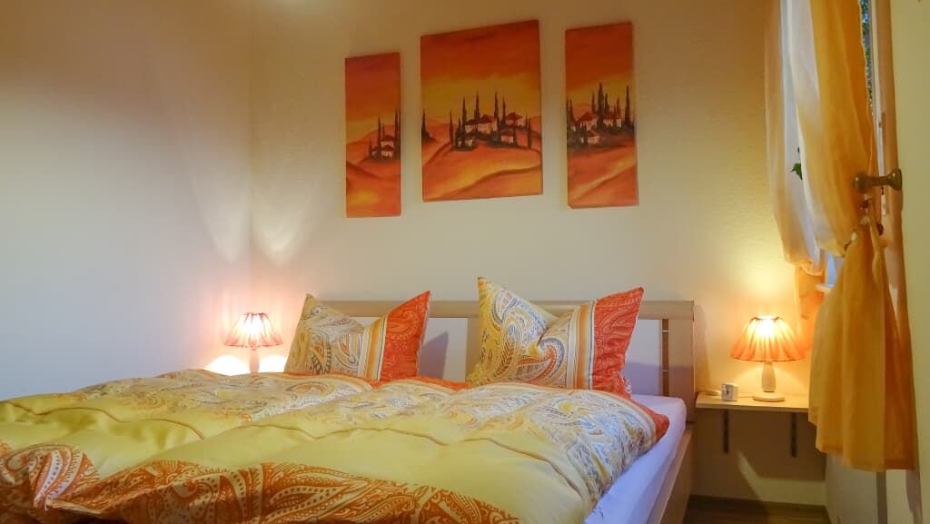 Erholung und Harmonie finden Sie im gemütlichen Schlafzimmer mit Doppelbett. Das Fenster zur Westseite kann durch einen Rollo komplett verdunkelt werden. Das liebevoll abgestimmte Farbkonzept weckt am Morgen neue Lebensgeister. Bettwäsche wird selbstverständlich für Sie bereitgestellt, ebenso zwei zusätzliche Kopfkissen und zwei Kuscheldecken.