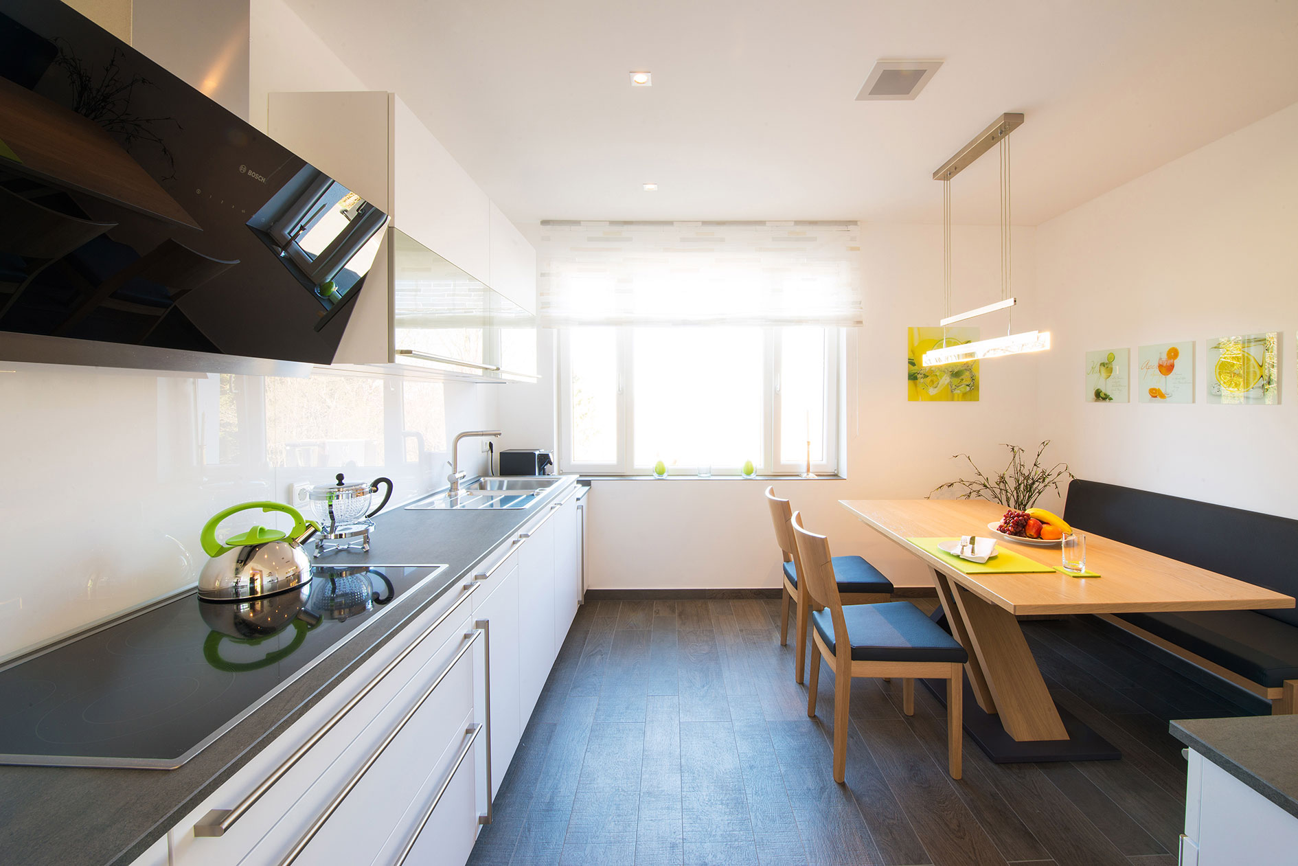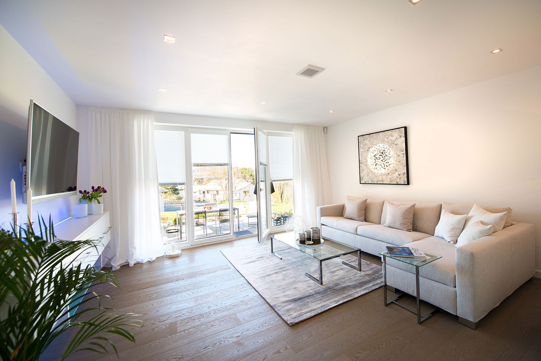 Eine großzügige, vollausgestattete Küche, das luxuriöse Design-Bad mit Floating-Wanne, ein lichtdurchflutetes Schlafzimmer mit separater Ankleide, das stilvolle Wohnzimmer mit Zugang zur großen Sonnenterrasse sowie Fußbodenheizung und Dimmer-Beleuchtung in sämtlichen Räumen erfüllen selbst höchste Ansprüche.