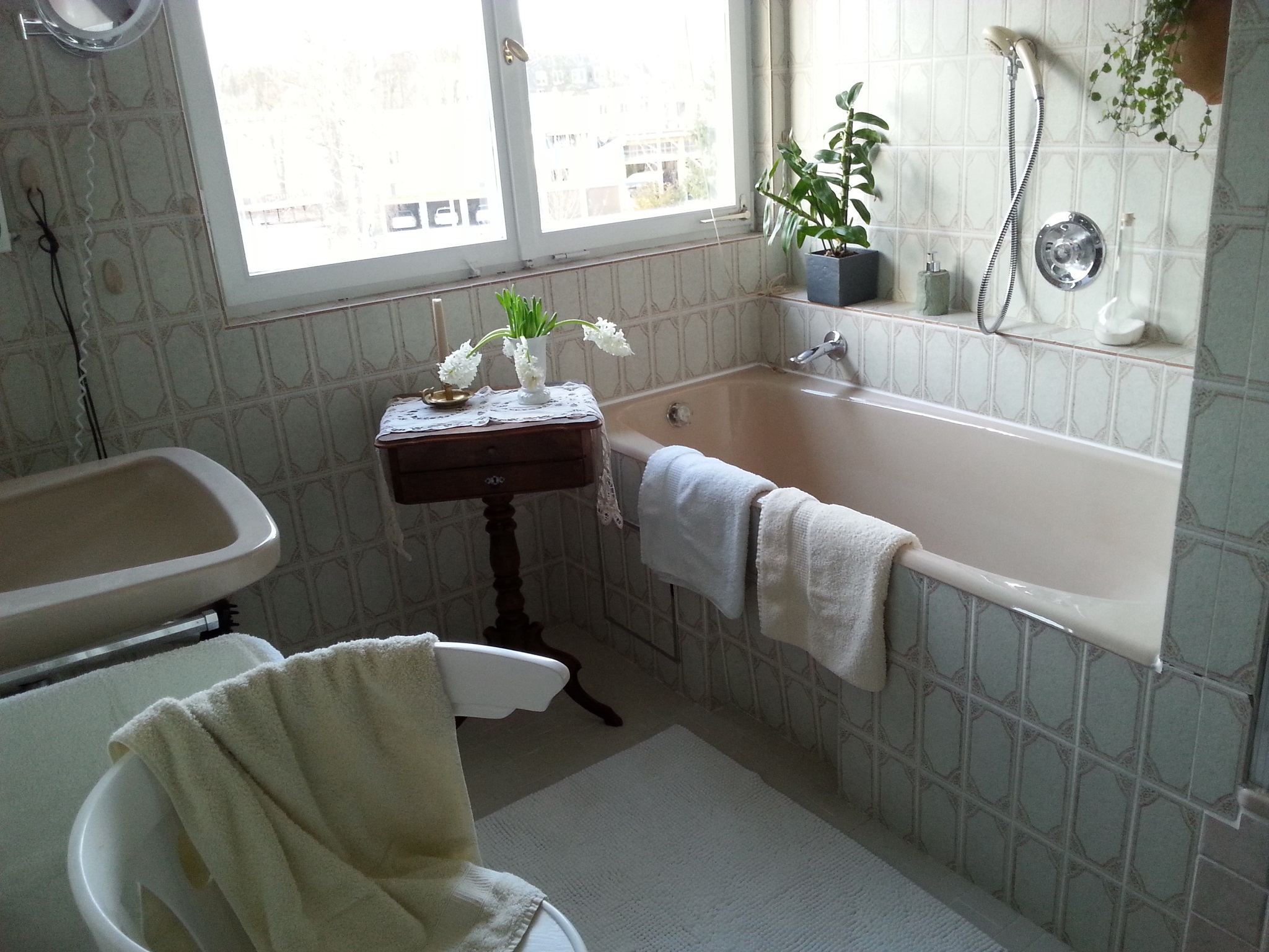 Im Badezimmer haben Sie die Möglichkeit sowohl die Dusche, als auch die seperate Badewanne zu nutzen. Ein WC befindet sich in einem kleinen Raum nebenan.