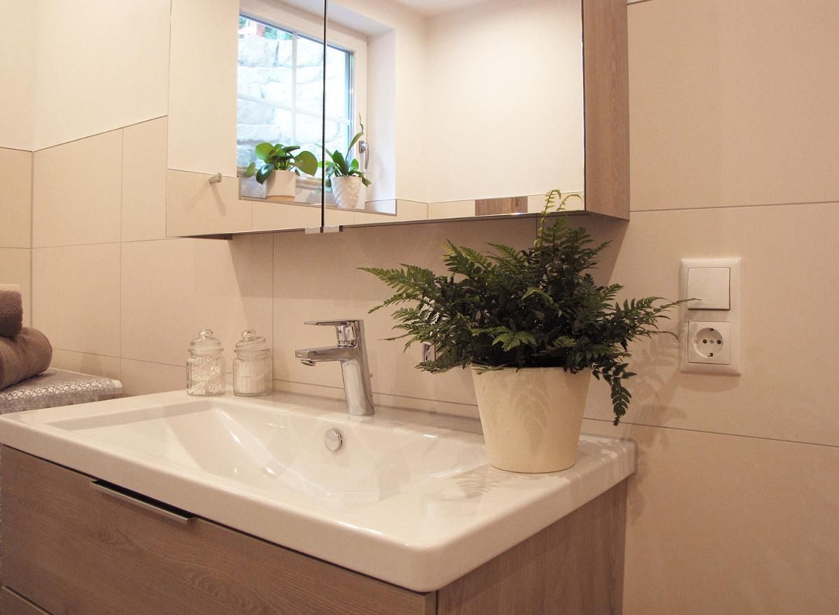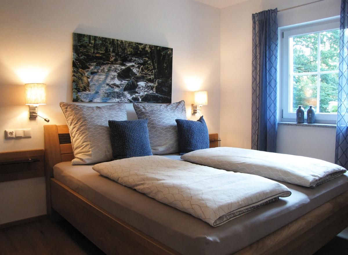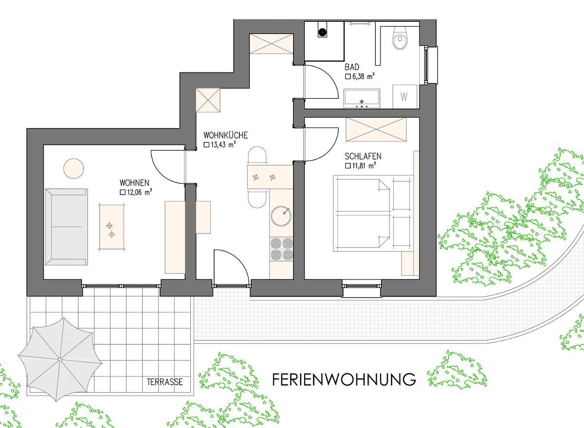 Genießen Sie unsere mit Liebe eingerichtete Ferienwohnung. Unsere gesamte Ferienwohnung ist mit Fußbodenheizung ausgestattet. Es erwartet Sie eine voll ausgestattete Küche mit Spülmaschine, Backofen mit Ceran-Kochfeld sowie ein Kühlschrank inklusive Gefrierfach für die Zubereitung Ihrer vegetarischen oder veganen Speisen. Auch unser Badezimmer lädt zum Entspannen ein: eine geräumige, ebenerdige Dusche, ein großer, gut beleuchteter Spiegel, viel Ablagefläche und kuschelige Handtücher aus Bio-Baumwolle. Auch eine Waschmaschine und ein Föhn stellen wir Ihnen gerne bereit. Das gemütliche Schlafzimmer mit Korkboden verfügt über ein großes Doppelbett, Kleiderschrank und Leselampen. Direkt vom Bett aus können Sie ab dem Frühjahr den morgendlichen Reviergesängen der Waldvögel lauschen. Vom Wohnzimmer aus können Sie mit etwas Glück Wildtiere wie Rehe oder Feldhasen durch die große Glasfront beobachten, die oft nur wenige Meter entfernt vor der Ferienwohnung äsen. Außerdem ist das Wohnzimmer mit einem Fernseher, einem Couchtisch, einem Schlafsofa und Wanderkarten sowie Büchern zum Schmökern ausgestattet. Direkt vor dem Wohnzimmer der Ferienwohnung liegt die Terrasse mit einer gemütlichen Sitzgruppe, so dass Sie hier während der warmen Monate – unter einer Pergola geschützt – draußen Essen können. Zusätzlich können Sie Ihre Auszeit in zwei Liegestühlen genießen. Mit unseren zwei Outdoordecken und der richtigen Kleidung steht so einem Sonnenbad auch in den Wintermonaten nichts entgegen. 4000 qm ist das Grundstück groß – hier sehen Sie: Grün, Bäume, Natur. Keine Nachbarn, keine anderen Gäste.