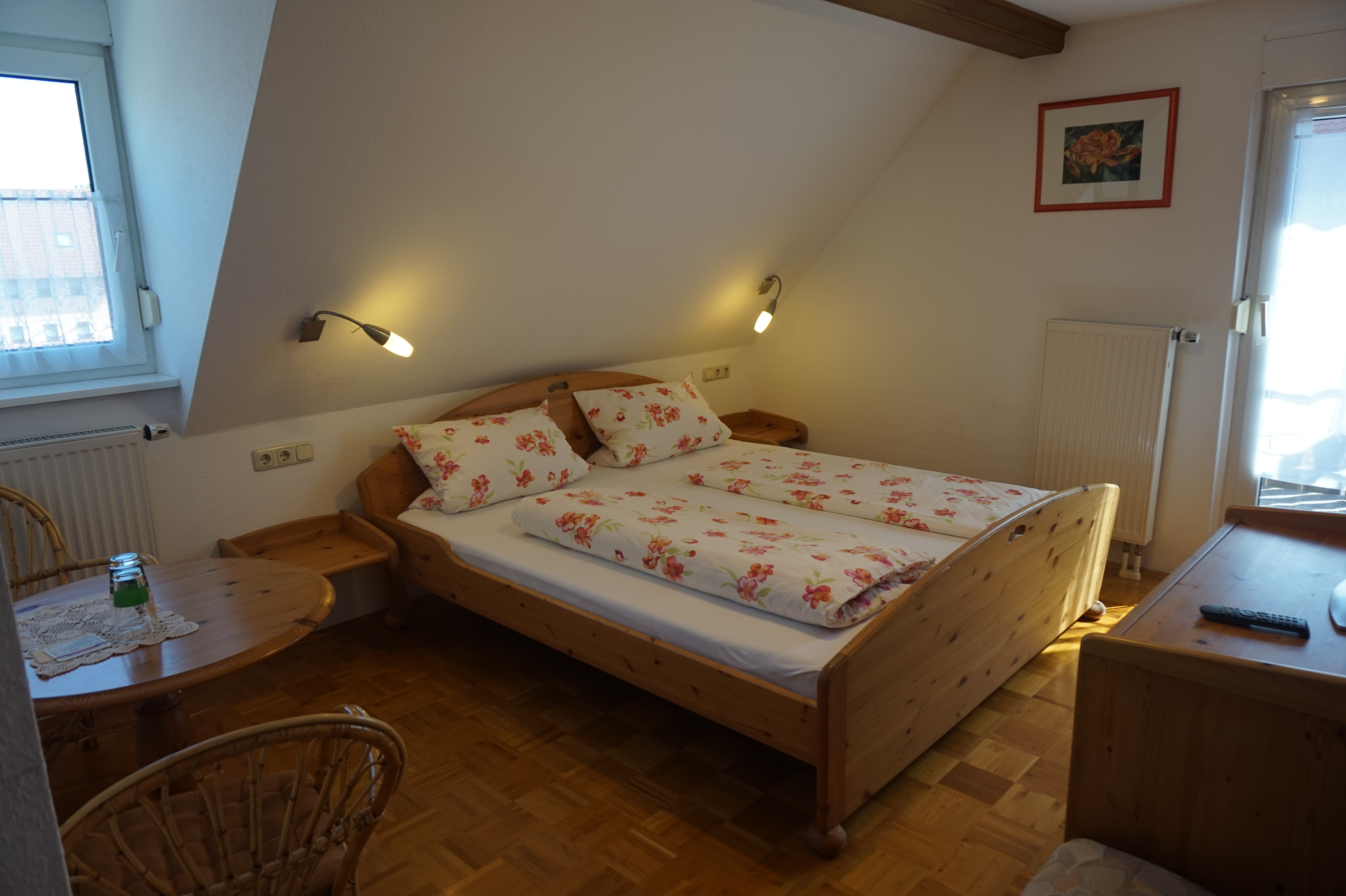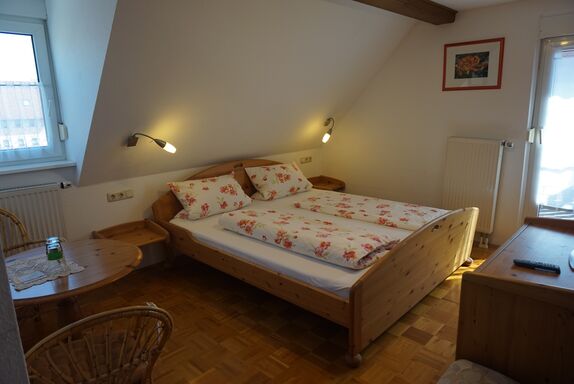 Das gemütliche Doppelzimmer mit 15 qm Wohnfläche mit Südbalkon ist mit Massivholzmöbeln und Parkettboden eingerichtet und somit allergikerfreundlich. Das Schlafzimmer mit Doppelbett bietet Platz für bis zu zwei Personen. Das Badezimmer ist mit Dusche und WC ausgestattet. Außerdem befindet sich ein Fernseher und kostenloses Wlan als technische Ausstattung im Zimmer.