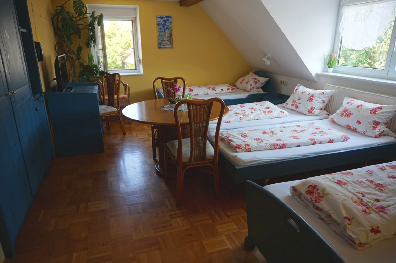 Das gemütliche Zimmer ist mit Massivholzmöbeln und Parkettboden eingerichtet. Zu den zwei Einzelbetten können zusätzlich zwei weitere Betten aufgestellt werden. Das Badezimmer ist mit Dusche, WC, Föhn und Handtüchern ausgestattet. Außerdem sind ein Fernseher, Telefon und kostenloses Wlan vorhanden.