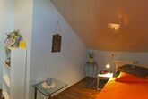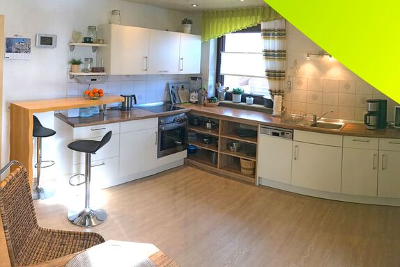 Die 85 qm große Ferienwohnung befindet sich im ersten Obergeschoss und verfügt über ein großes Schlafzimmer, zwei kleinere Schlafzimmer mit je einem Einzelbett, ein geräumiges Wohnzimmer, eine vollausgestattete Küche mit einer Frühstückstheke und einem großen Essplatz, sowie ein Badezimmer mit Badewanne, Dusche, WC und Waschmaschine.