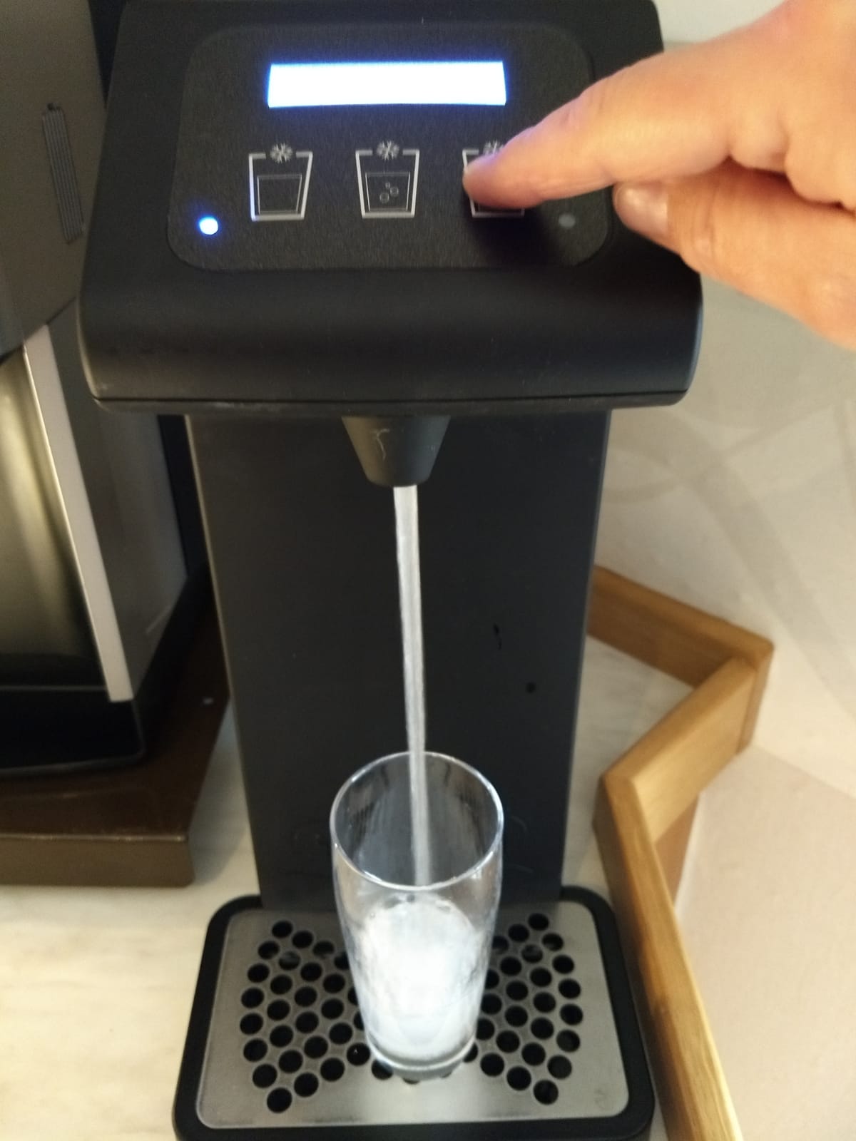 Wasserspender mit kostenlosem Trinkwasser still, medium oder spritzig im Aufenthaltsraum.
