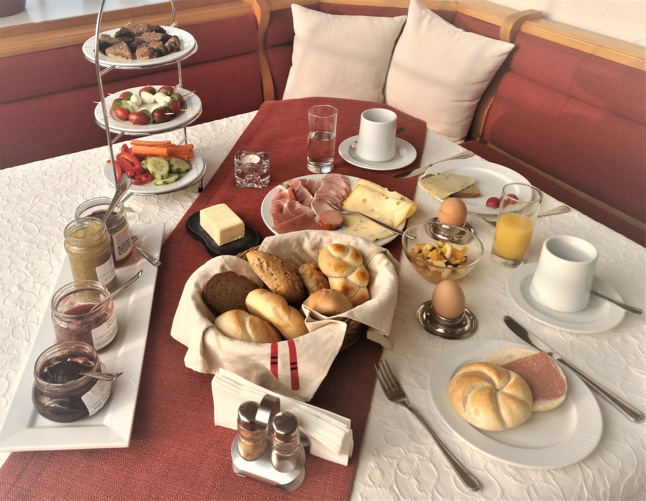 Reichhaltiges Frühstücksbuffet inclusive zweier Kaffeespezialitäten für EUR 9,50 pro Person und ab und zu Abendessen um 18.30 Uhr ebenfalls für EUR 12,- kann vor Ort dazugebucht werden.