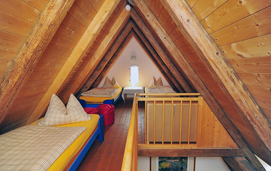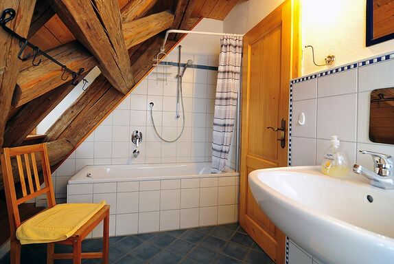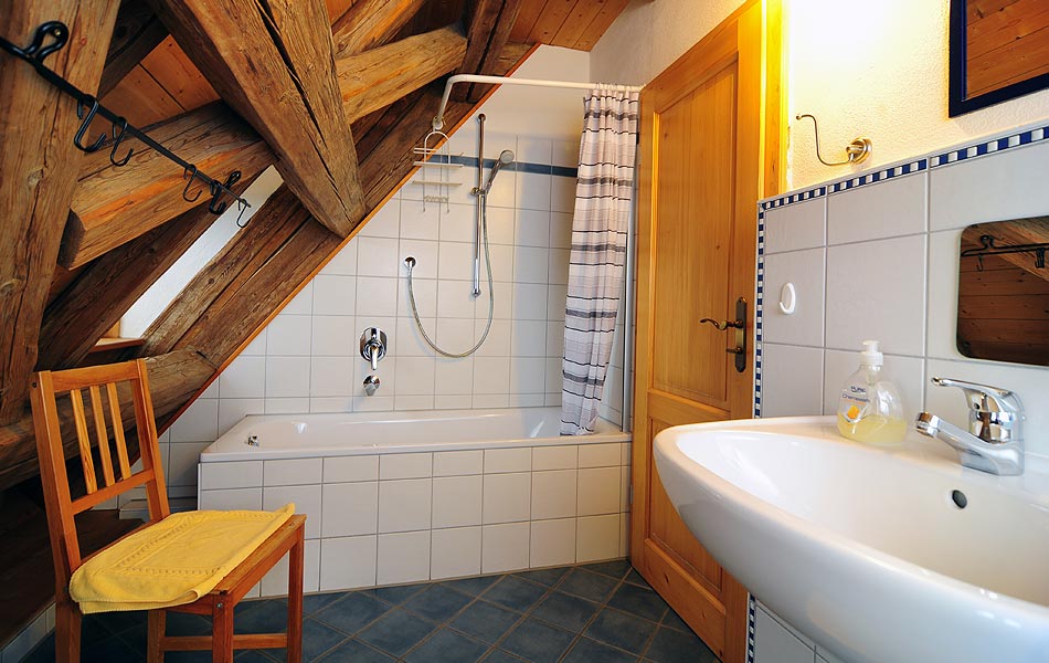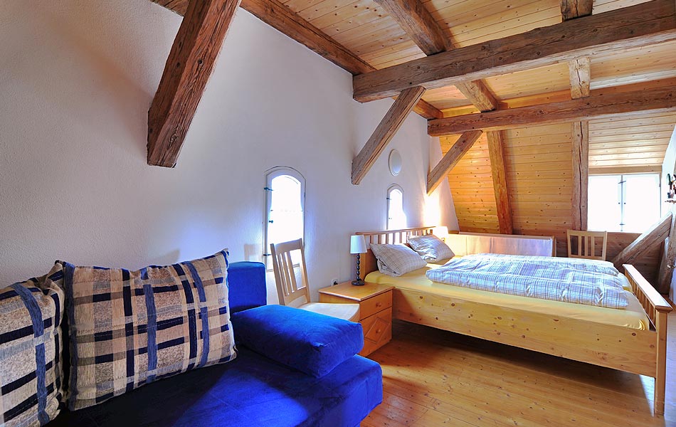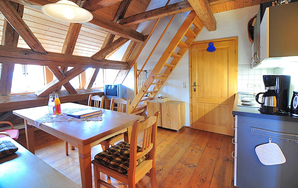 Die Kornkammer liegt im Dachgeschoss des denkmalgeschützten Austraghauses. Der naturbelassene Dachstuhl verleiht dieser Wohnung einen ganz besonderen Charme.