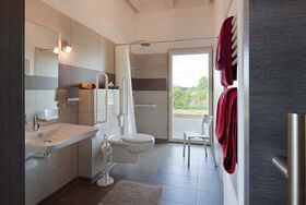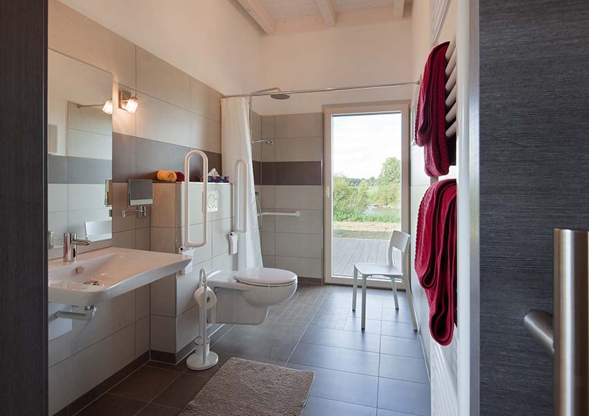 Die barrierefreie Wohnung hat ein Schlafzimmer mit Doppelbett, ein Schlafzimmer mit zwei Einzelbetten, bodengleiche Dusche, WC mit Haltegriffen und eine großzügige Wohnküche mit Panoramafenster und direktem Zugang auf die Terrasse. Hier sind Sie mit der Natur auf Tuchfühlung.