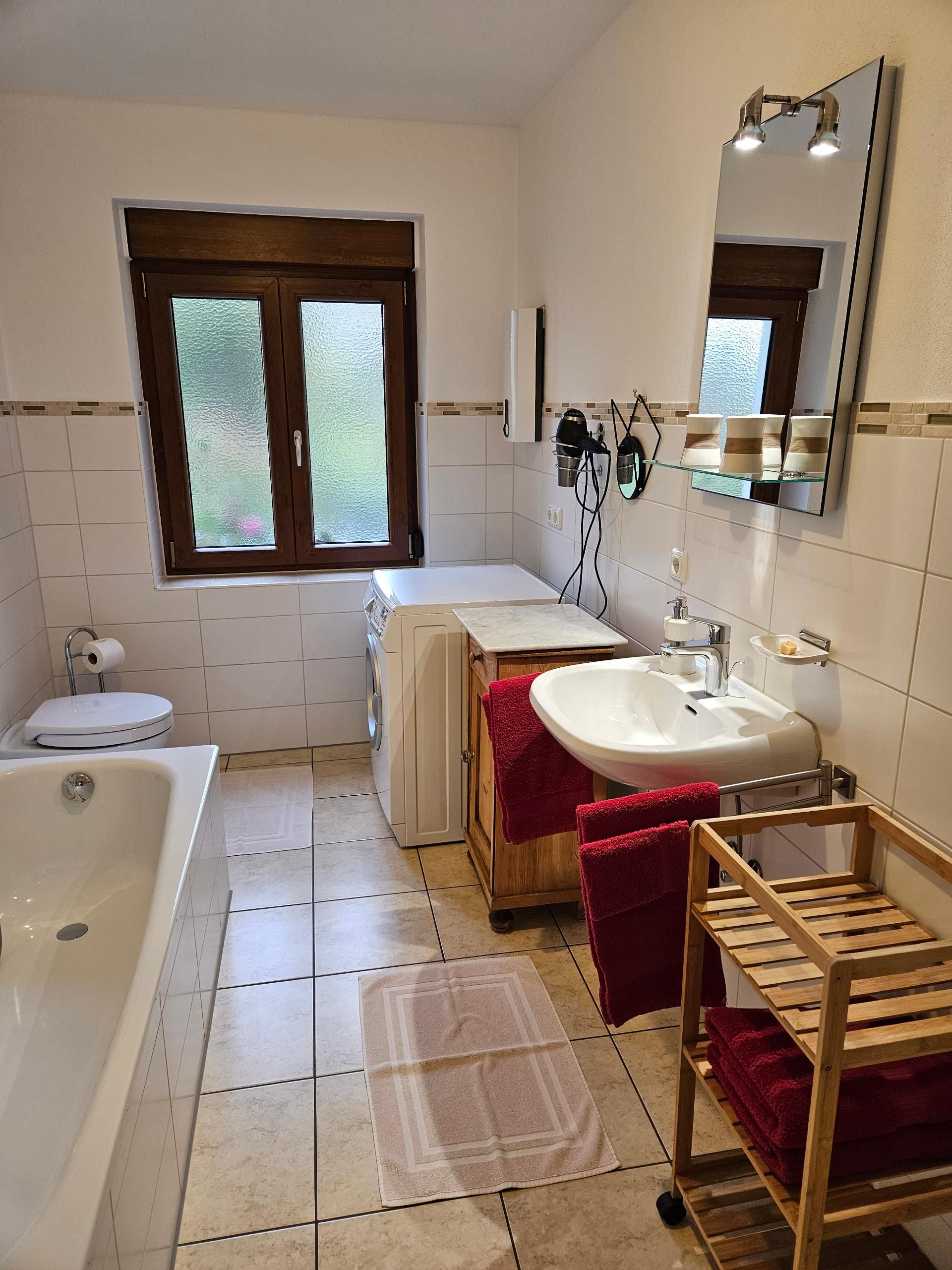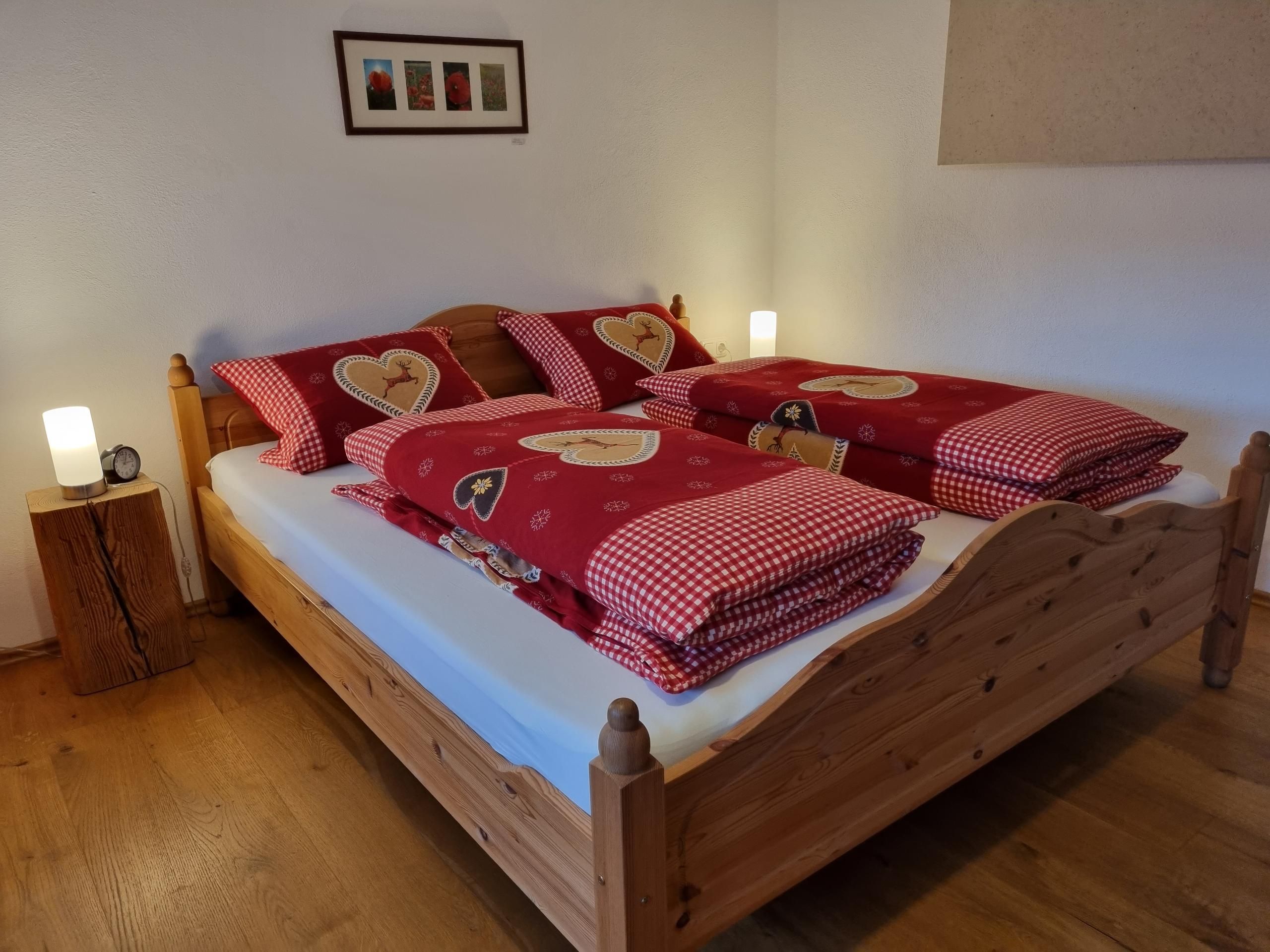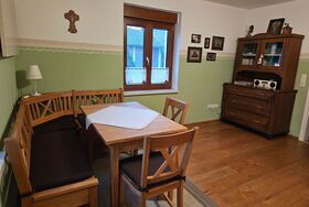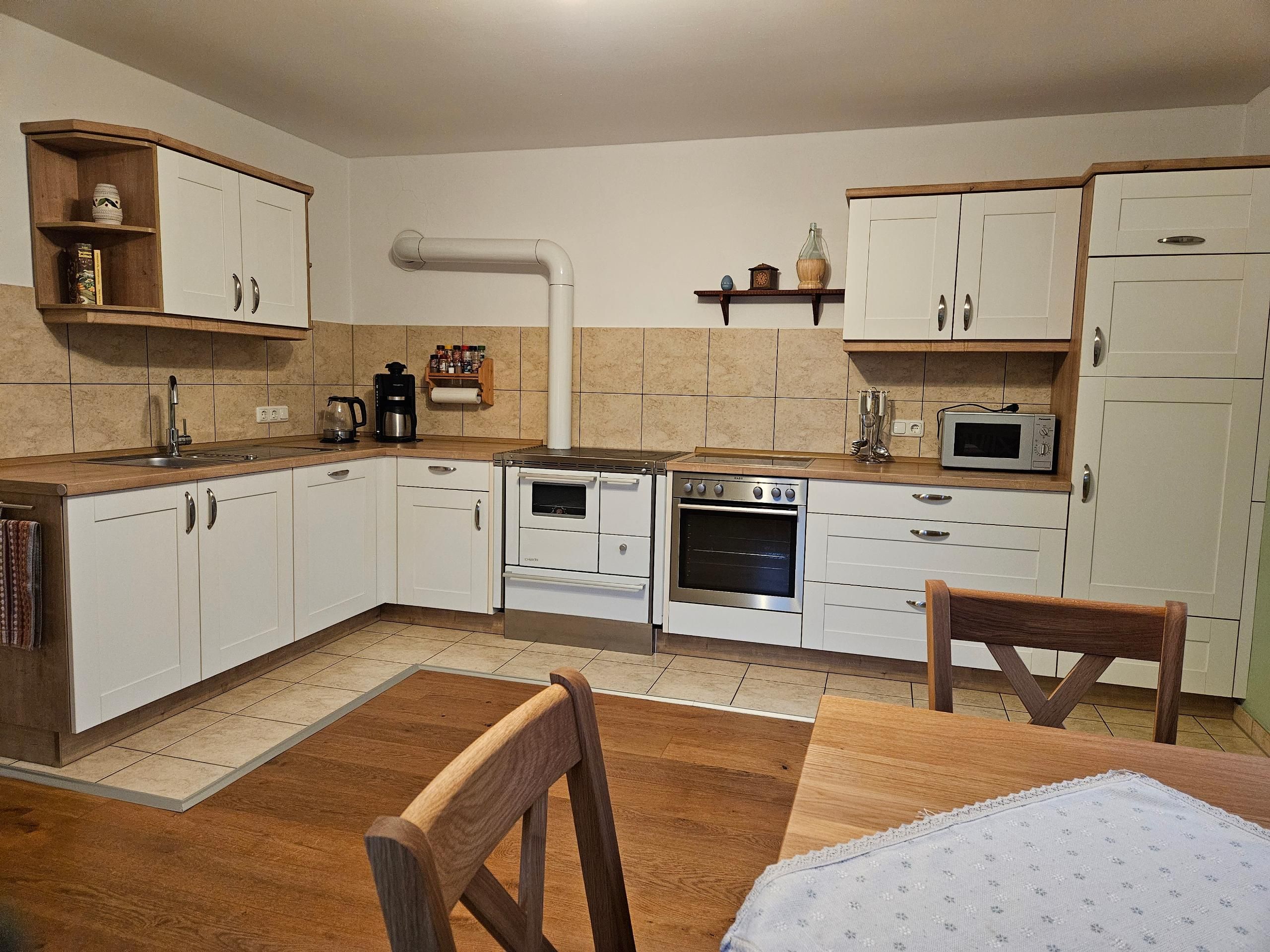 Die Ferienwohnung liegt abgeschlossen im Erdgeschoss des Bauernhauses mit eigenem Eingang. Sie ist mit 80 qm sehr großzügig bemessen - hier müssen Sie nicht auf beengtem Raum aufeinanderhocken. Eine geräumige Wohnküche, ein großer Wohn-/Schlafraum und ein kleineres Schlafzimmer bieten Platz für 4 Erwachsene. Die moderne, hochwertige Ausstattung wurde mit alten Bauernmöbeln aus dem Bestand kombiniert. Die wuchtigen Balken der abgerissenen Scheune dienen als Nachttische und ein abgeschliffenes Nachtkästchen als Badmöbel. Traditionelle Gebrauchsgegenstände aus alten Zeiten sind tolle Dekoobjekte. Die Familienfotogalerie in der Küche vermittelt eine Atmosphäre wie anno dazumal - sie gehören quasi zur Familie.