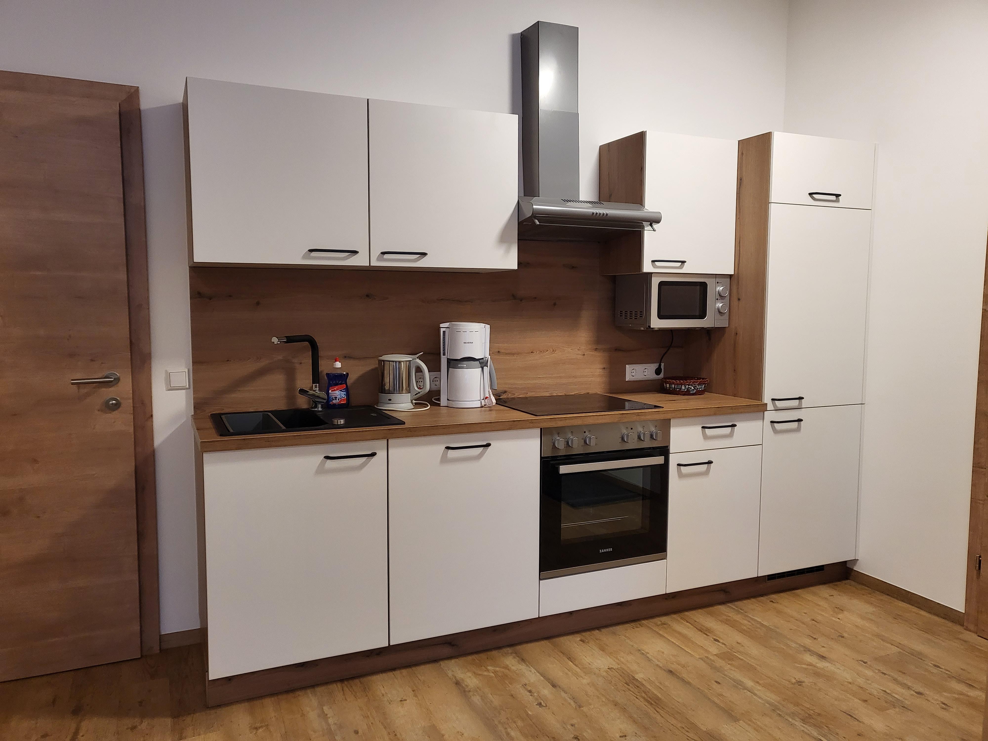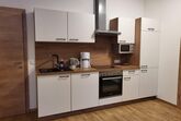 Die Wohnung ,,Enzian“ hat eine Wohnküche mit E-Herd, Backrohr, Mikro, Kaffeemaschine, Wasserkocher, Kühlschrank mit Gefrierfach und Geschirrspüler.