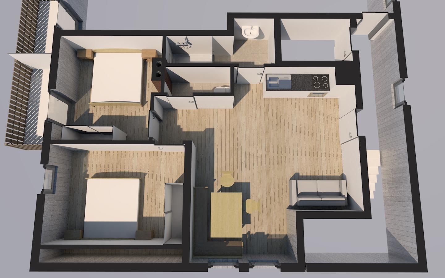 2 getrennte Schlafräume, Badezimmer mit Dusche, WC und Balkon zur Südseite.