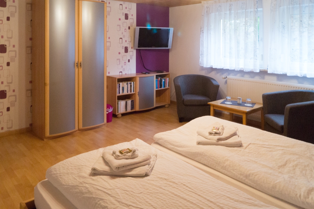 Unser liebevoll und modern eingerichtetes Doppelzimmer mit ca. 21 m² Wohnfläche verfügt über LCD-Fernseher und SAT-TV sowie kostenlosem Wlan. Ein eigener Aufenthaltsraum (16m²) mit Kaffeevollautomaten, Wasserkocher und Kühlschrank sowie Bad mit Du/WC/Fön steht zu Ihrer alleinigen Nutzung zur Verfügung. Ihr Apartment mit einer Gesamtfläche von ca. 42 m² befindet sich im Zwischengeschoß mit eigenem Eingang.