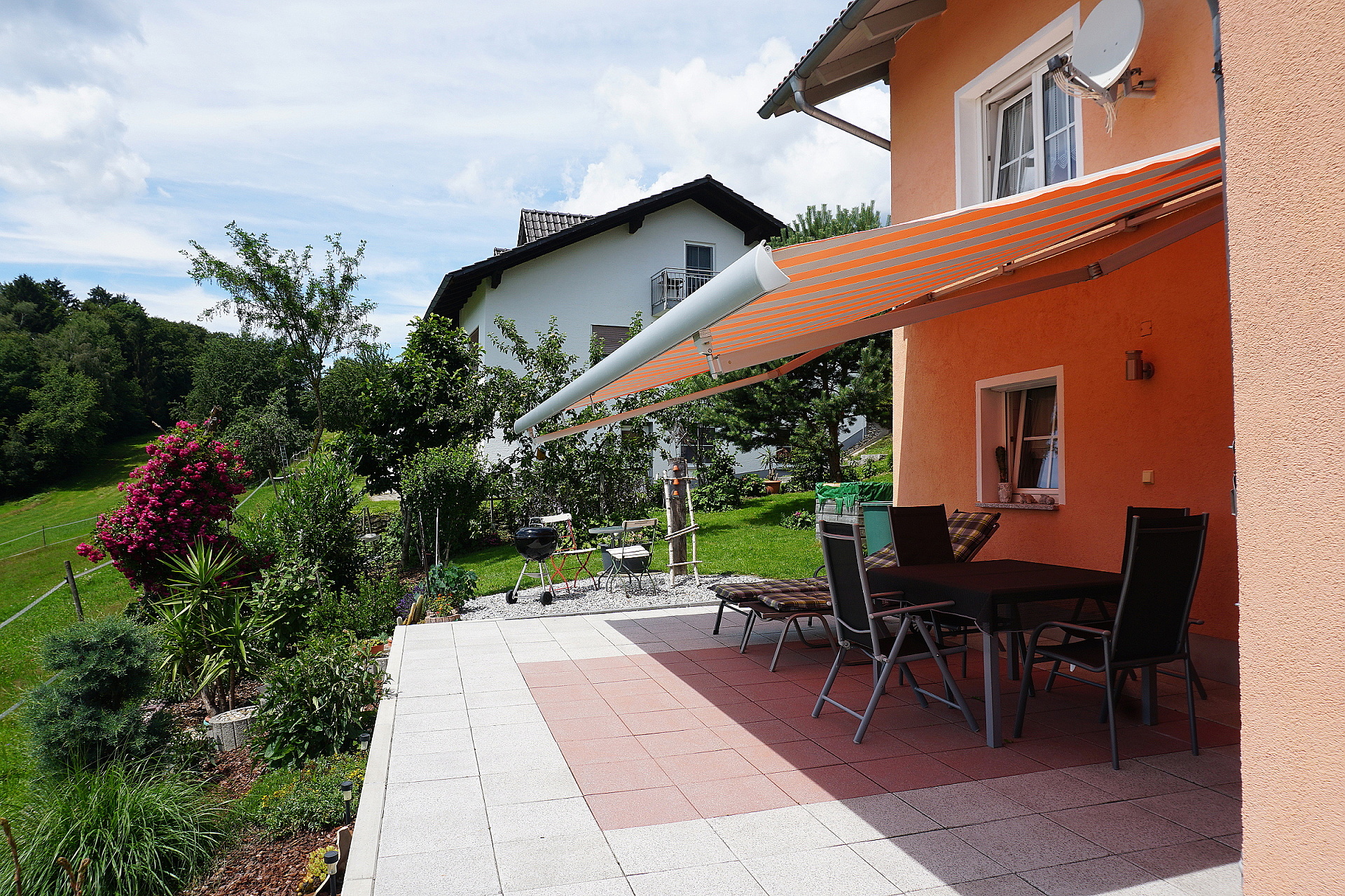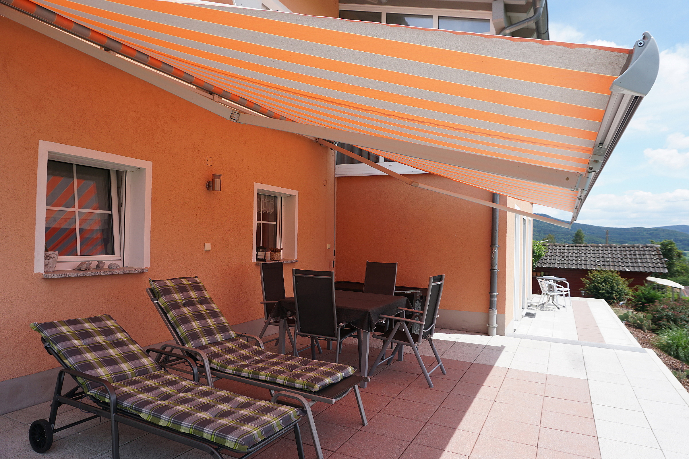 Die große Terrasse ca.50 m² ist mit Gartenmöbel ausgestattet und mit einer Markise beschattet, genießen Sie den herrlichen Panoramablick, mit etwas Glück an manchen Tagen bis zu den Alpen.