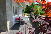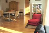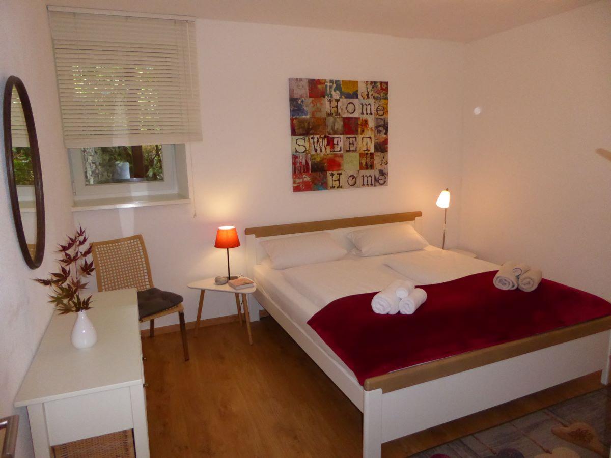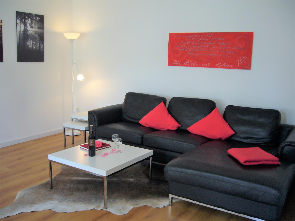Die moderne Ferienwohnung Harmonie (80 qm) im Landhausstil ist behindertengerecht im Erdgeschoß und bietet Platz für 2 - 4 Personen. Im gemütlichen und sehr großzügigen Wohnzimmer steht ein runder Esstisch mit 4 Stühlen, ein Sessel und eine große Eck-Couch mit Tisch, großer SAT-TV, DVD/CD-Player, Radio mit iPod- oder iPhone-Dock. In der komplett ausgestatteten Küche mit Spülmaschine, Kühlschrank und Herd/Backofen finden Sie außerdem Mikrowelle, Kaffeemaschine, Toaster, Mixer, Eier- und Wasserkocher. Im Schlafzimmer steht ein Doppelbett und im Wohnbereich eine Schlafcouch (140 x 200 cm). Das große Bad ist mit eigener Sauna, Regendusche, WC, Kosmetikspiegel und Fön ausgestattet. Ein zweites Bad mit extra großer Dusche und WC gehören ebenfalls zu dieser Wohnung. Die große Südterrasse (ca. 30 qm) mit Markise und überdachtem Freisitz auf der Westseite bietet Platz für 4 Personen. Zur Wohnung gehört ein abschließbarer Kellerraum für Fahrräder oder Ski im Carport.