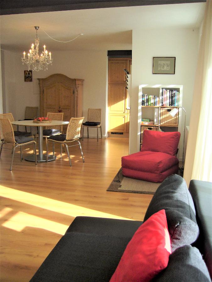Unsere großzügige Galerie-Ferienwohnung im Dachgeschoß mit offenem Wohnraum und geschwungenen Wänden, wirkt besonders großzügig. In dieser Fewo haben Sie 2 Schlafzimmer, ein Bad, 2 separate WC's. Eigene Waschmaschine.