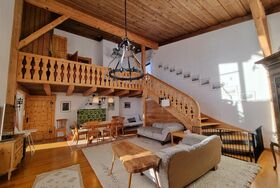 Ihren Urlaub verbringen Sie im 143 m² großen imposanten Ferienhaus Mauth mit Echtholzparkett auf 2 Ebenen. Blickfang ist der lichtdurchflutete Wohnbereich mit 10m hoher Decke mit großer, gemütlicher Galerie, einem Kachelofen mit Sitzgelegenheit, Flachbild-TV in den Schlafzimmern und im Wohnzimmer und Schlafsofa. Zur voll ausgestatteten Küche, mit Geschirrspüler und Gas- sowie Elektroherd, gelangen Sie über das separate Esszimmer. Im oberen Stockwerk des Ferienhaus Mauth befinden sich 2 Schlaf- und 1 Kinderzimmer, sowie ein separates WC und ein Bad mit Dusche und Badewanne.