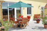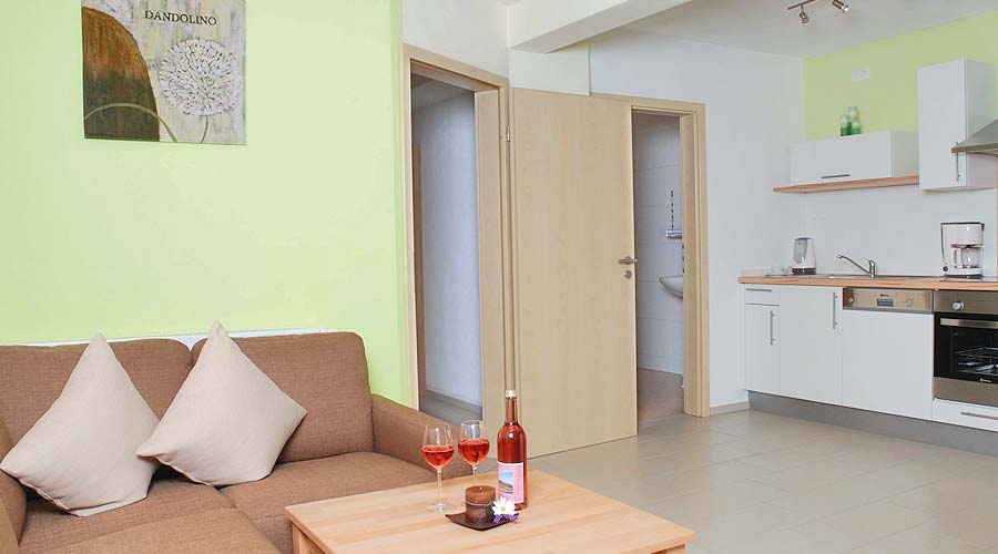 Diese Wohnung (55 qm) ist direkt unterhalb des ehemaligen Heubodens gelegen. Von der Wohnung aus haben Sie über das große Glaselement den gesamten Hofraum inklusive Kinderspielbereich im Blick – ideal für Familien mit kleinen Kindern! Bettwäsche und Handtücher sind vorhanden.