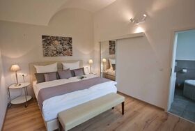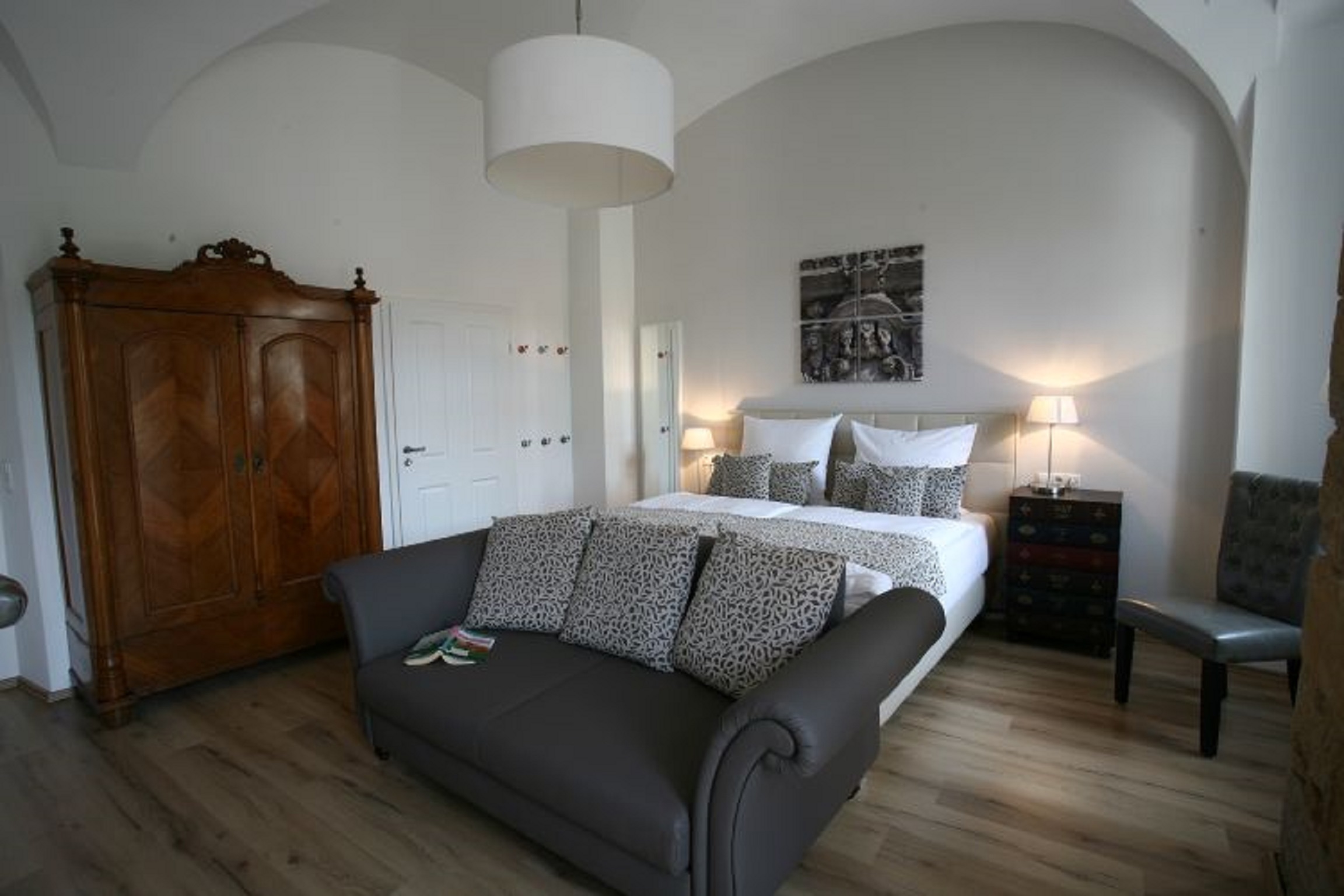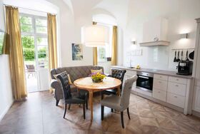 Ferienwohnung Klostersuite hat 80 qm Wohnfläche bietet Platz für 1-4 Personen. Das Wohnzimmer mit gemütlicher Essecke und Ohrensessel hat auch einen Fernseher, Steckdosenradio und einen Zugang auf die großflächige Terrasse. Schlafzimmer 1 Doppelbett, mit angenzendem Bad,mit Badewanne, Regendusche und WC ausgestattet. Schlafzimmer 2 mit Doppelbett hat Zugang zur zweiten Terasse. Das anliegende Badezimmer ist mit Regendusche,WC, Waschmaschine und Trockner ausgestattet. Alle Zimmer besitzen Fußbodenheizung und Gewölbedecken. Die Ausstattung ist mit Markengeräten und Antiquitäten hochwertig. Auf Wunsch kann man ein Kinderbett und Hochstuhl dazubestellen, Haustiere sind nicht erlaubt. In der vollständigen Küchenzeile im Wohn-und Essbereich stehen Ihnen Geschirrspüler, E-Herd mit Ceranfeld, Kühlschrank mit Gefrierschrank, Kaffeeautomat, Toaster, Eierkocher und Mikrowelle für Sie bereit.