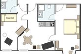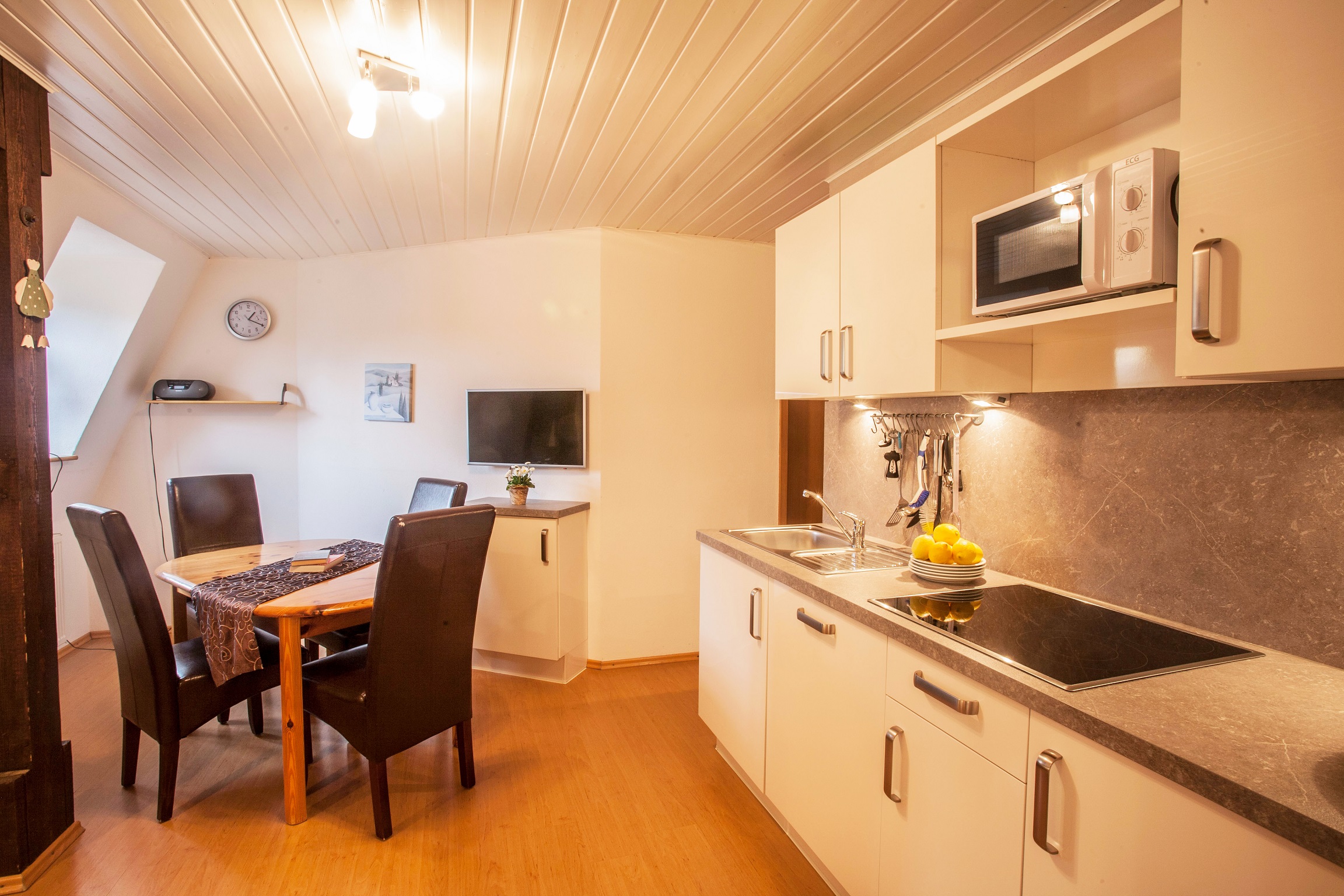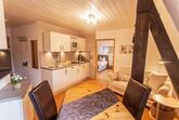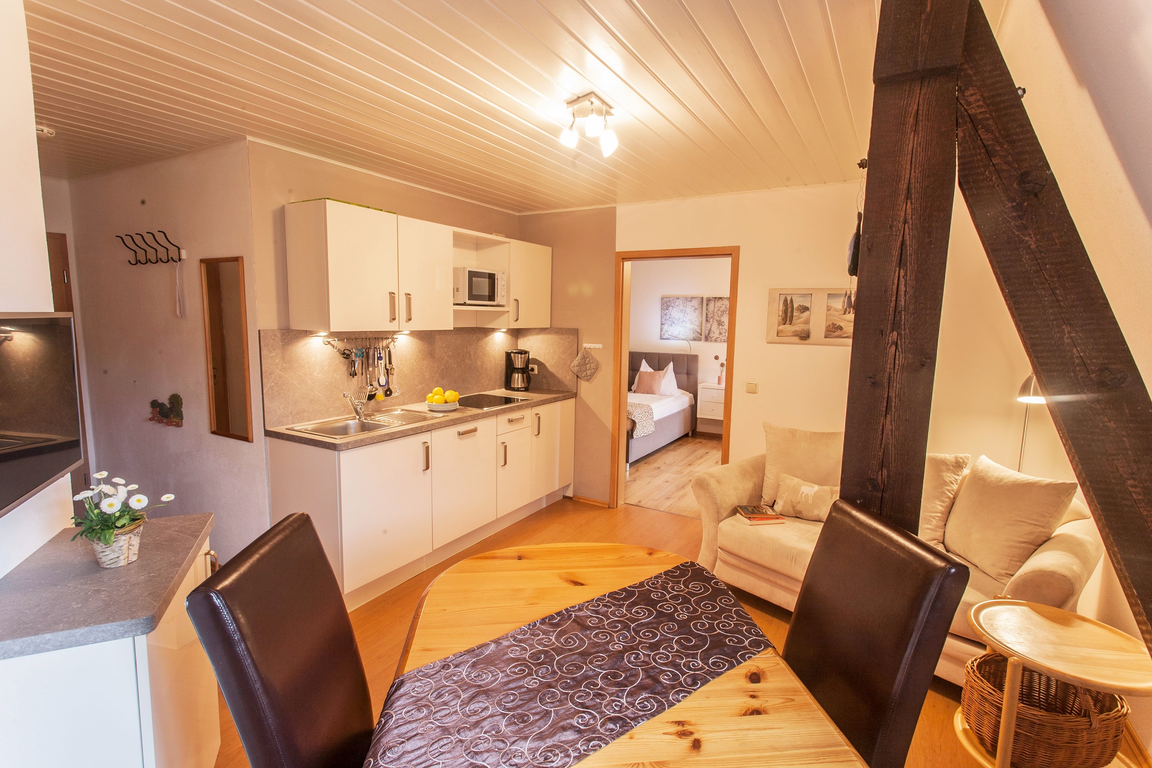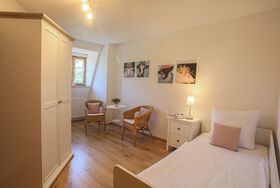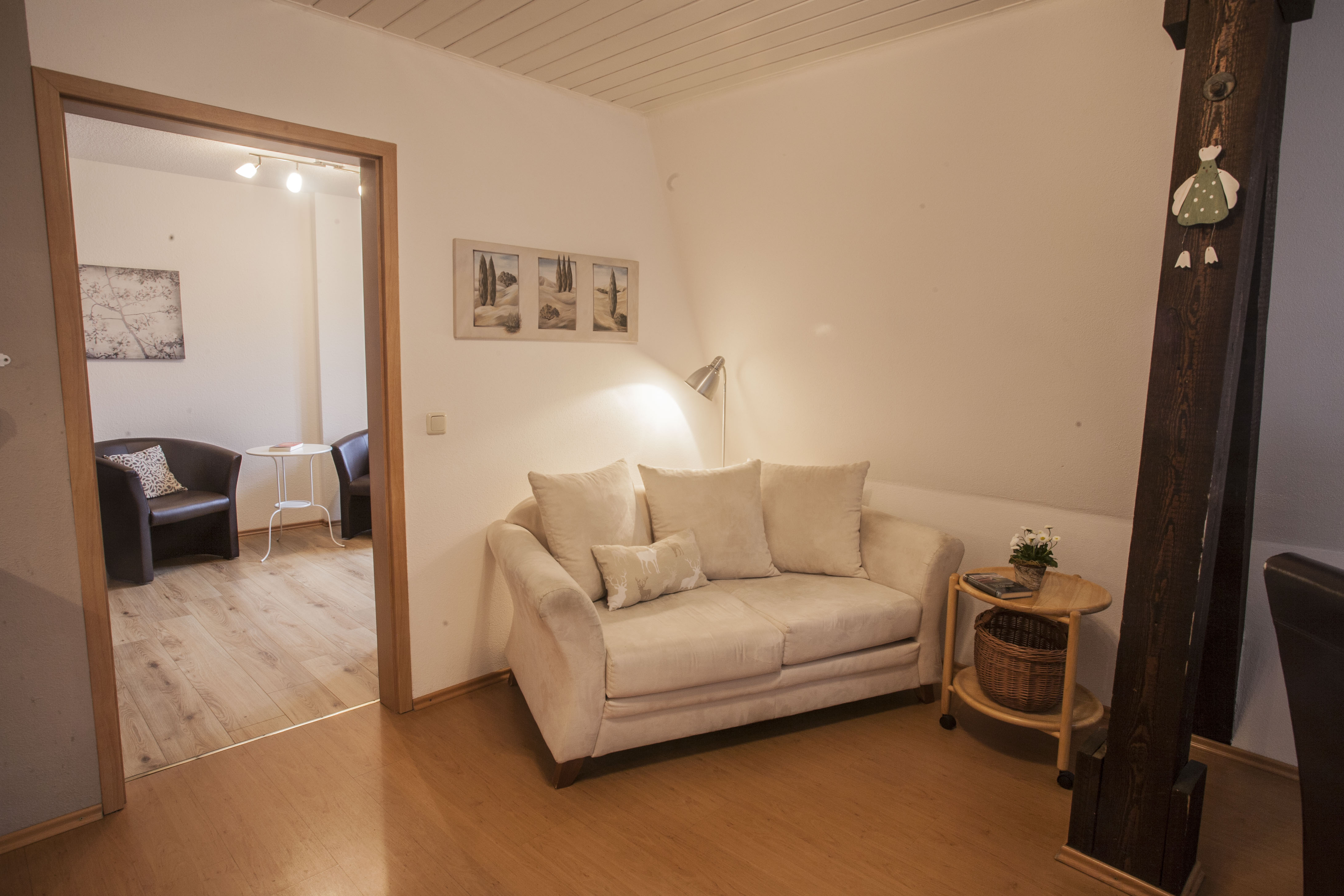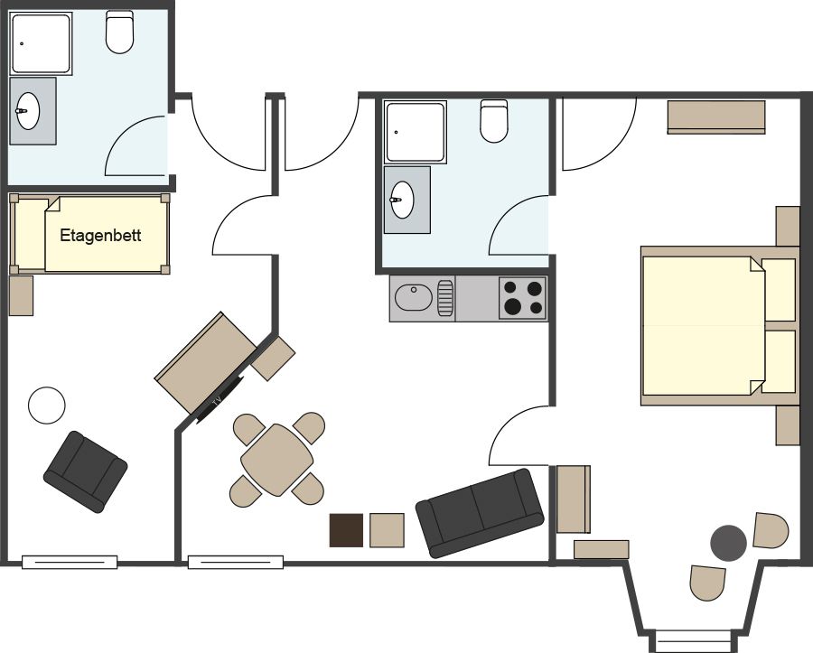 Die Ferienwohnung Blauer Turm ist mit ihrer 57qm Wohnfläche geeignet für bis zu 3 Personen. In der Wohnküche gibt es eine gemütliche Essecke und ein Sofa. Die Küche mit Elektroherd mit Ceranfeld, Mikrowelle, Toaster, Kühlschrank mit Gefrierschrank, Spülmaschine, Wasserkocher, Tischwäsche und Kaffeemaschine lässt keine Wünsche übrig. Das erste Schlafzimmer ist mit einem Doppelzimmer versehen, das Zweite mit einem Einzelbett. Beide Zimmer haben direkten Anschluss an ein Badezimmer, das jeweils mit Dusche, WC, Föhn und Handtücher ausgestattet ist. Mit Fernseher, Radio und Wlan ist die Wohnung auch technisch gut ausgestattet.