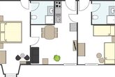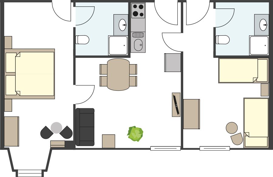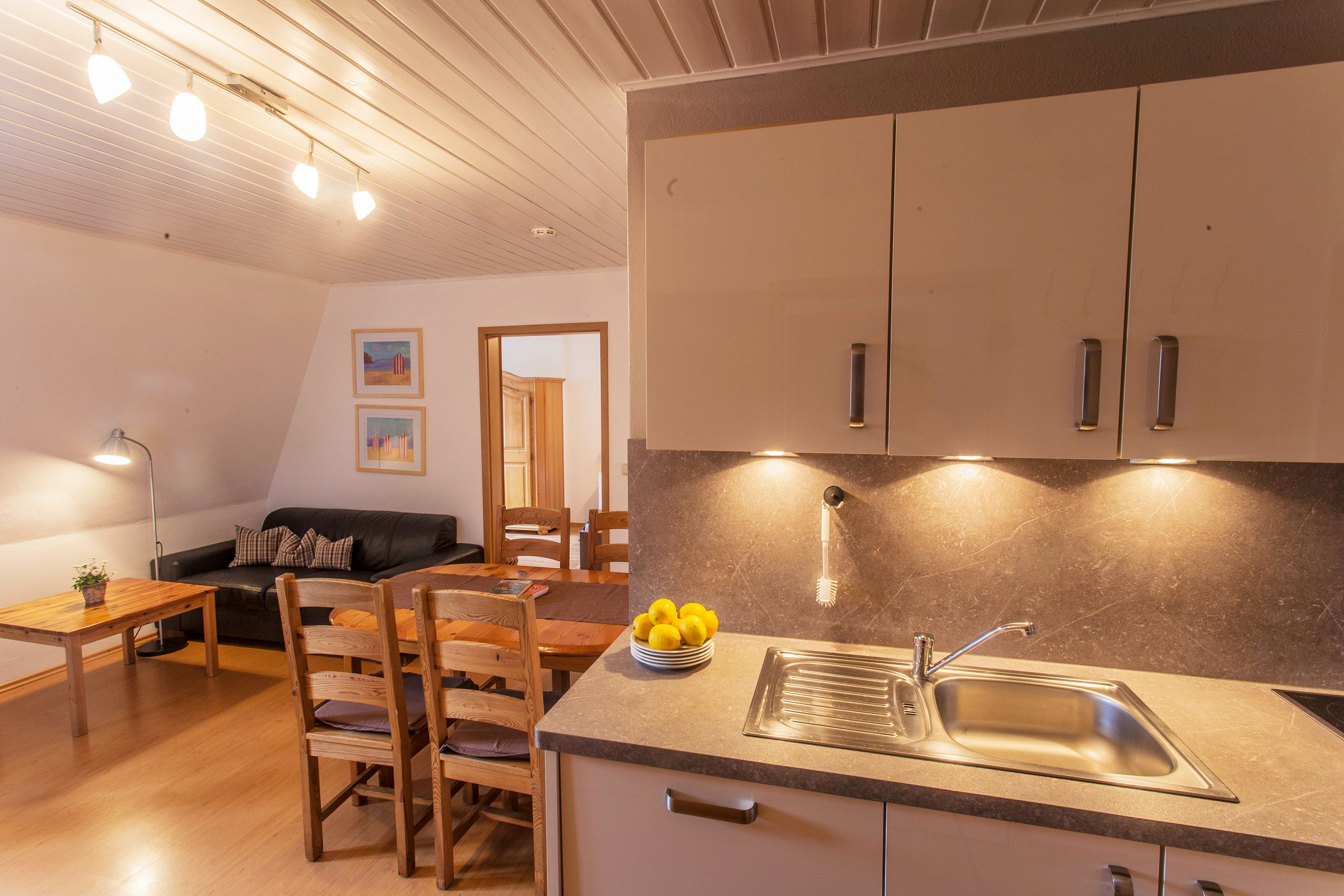 Die Ferienwohnung bietet mit 61qm Platz für 1 - 4 Personen. Die Wohnküche ist mit einer gemütlicher Essecke und einem Sofa ausgestattet. Die beiden Schlafzimmer sind einmal mit Doppelbett und einmal mit zwei Einzelbetten ausgestattet und haben jeweils ein anliegendes Badezimmer mit Dusche und WC. Die Betten sind bereits bei Ihrer Ankunft überzogen. In der Küche stehen Ihnen bereit: Ein Elektroherd mit Ceranfeld, Backofen, Spülmaschine, Kühlschrank mit Gefrierschrank, Toaster, Wasserkocher, Tischwäsche und natürlich eine Kaffeemaschine.