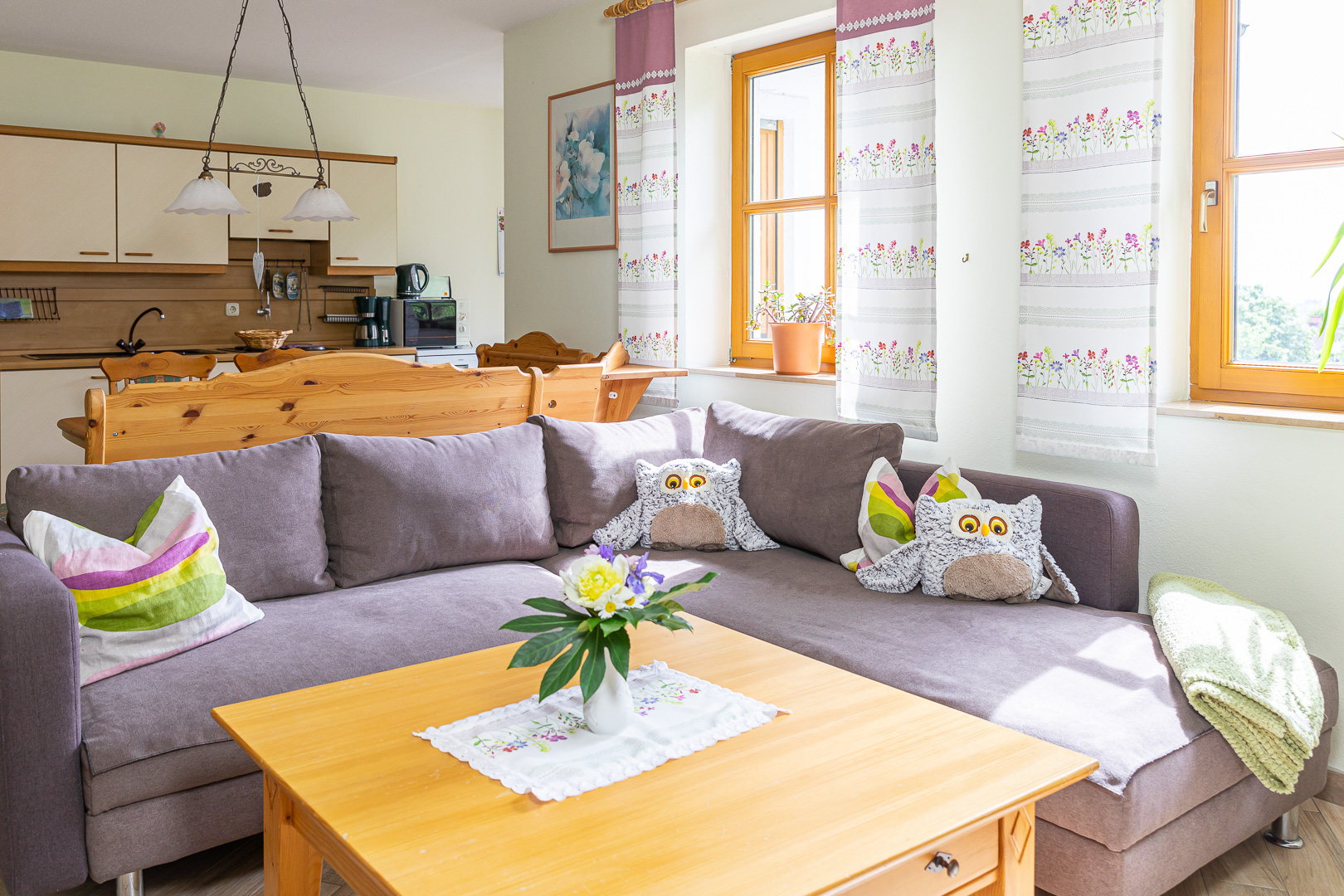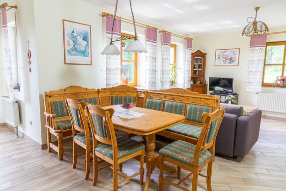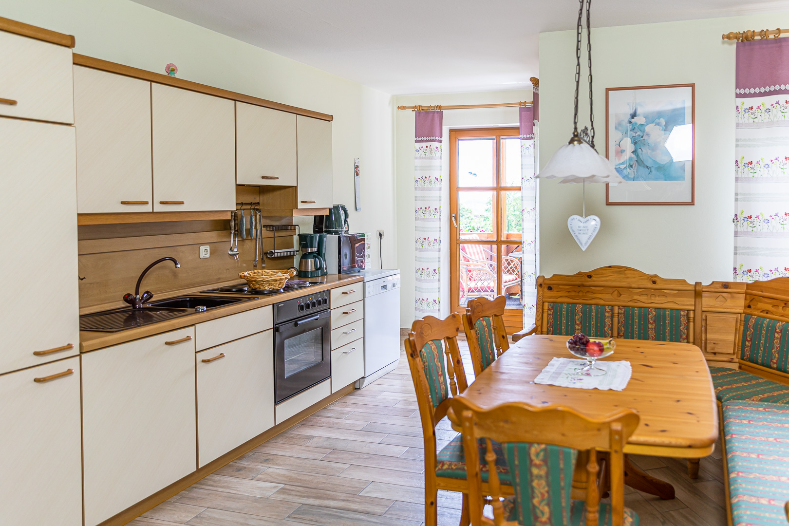 Unsere FEWO Birkenhain befindet sich im 1. Stock mit Blick auf das Fichtelgebirge, der Plassenburg und unserem Hausberg Kordigast. Diese FEWO verfügt über 2 Schlafzimmer ein Bad mit WC und Dusche und einem großen Wohnraum mit Küchenzeile die ausgestattet ist mit Spülmaschine, Kaffeemaschine, Wasserkocher, Elektroherd und Mikrowelle.