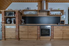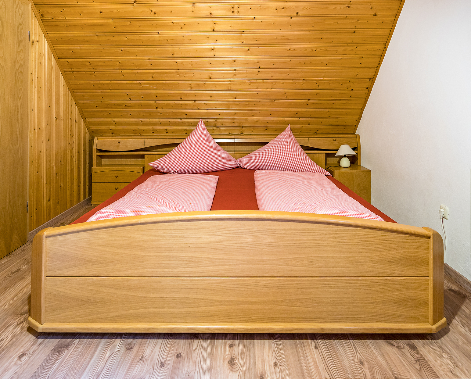 Unsere Ferienwohnung mit 70 qm Wohnfläche bietet Platz für bis zu 5 Personen.Hier wohnt man auf zwei Ebenen, die zwei großen Schlafzimmer mit jeweils einem Doppelbett befinden sich auf der zweiten Ebene. Die Wohnküche ist sehr groß und verfügt über TV, außerdem ist die Küche mit Kaffeemaschine, Wasserkocher, Toaster, Elektroherd, Mikrowelle und Spülmaschine ausgestattet. Im Badezimmer mit Fenster ist eine Dusche und ein WC vorhanden, Handtücher und Bettwäsche gibt es auch. Eine Terrasse rundet die Wohnung ab.