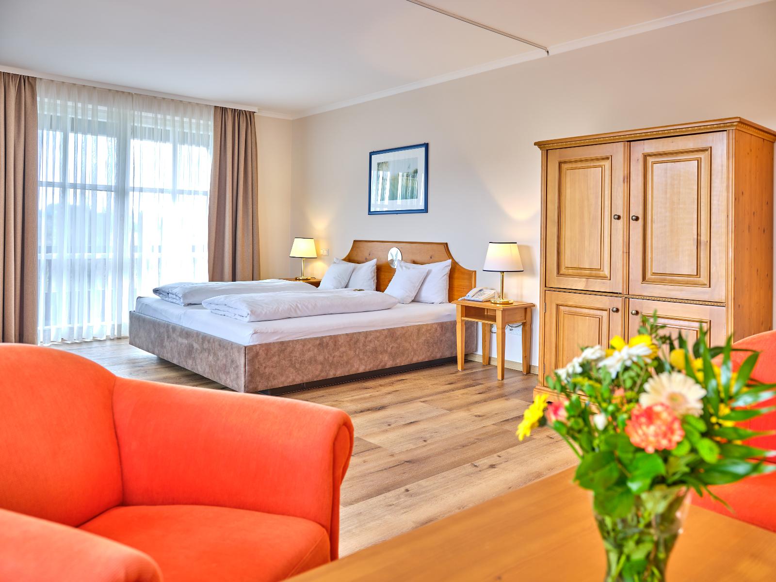 Die Junior Suite ist 40 qm groß und bietet Platz für bis zu drei Personen. Im geräumigen Wohn- und Schlafraum steht ein bequemes Doppelbett mit getrennten Matratzen, Zustellbett oder Ausziehcouch möglich. Dank dem großen Fenster, das zum Balkon führt ist der Raum lichtdurchflutet. Außerdem steht im Wohnzimmer eine gemütliche Couch, ein Sessel, ein SAT-TV, eine Minibar, ein Zimmersafe und ein kleiner Tisch. Das Bad besteht aus Dusche und WC. Ihr Hund kann Sie auf Anfrage gerne begleiten. Das kostenlose WLAN im Zimmer können Sie gerne nutzen.