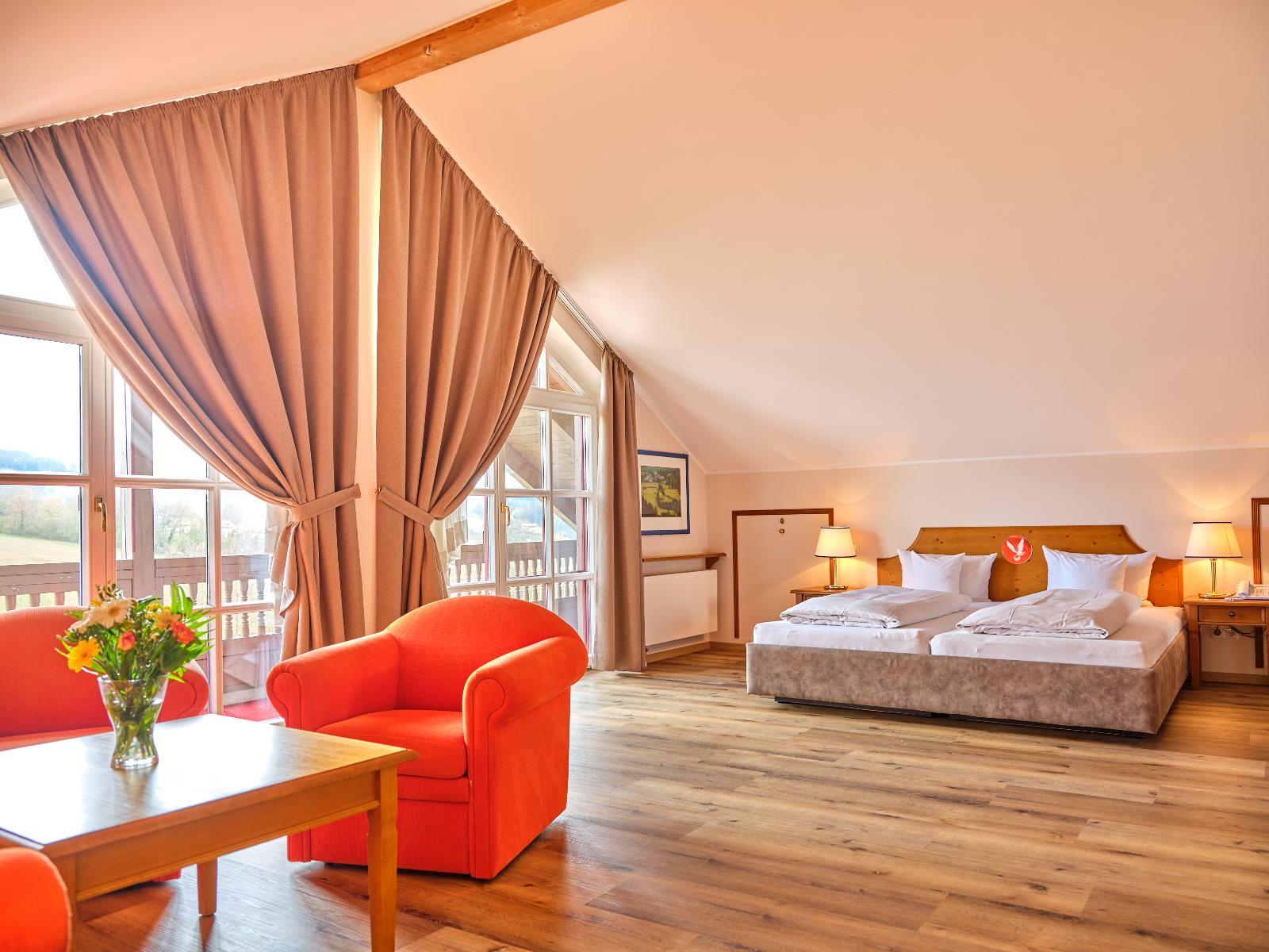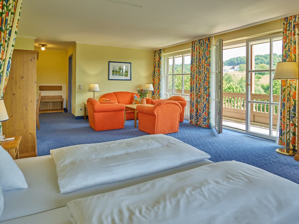 Die Senior Suite ist 60 qm groß und bietet Platz für bis zu vier Personen. Dank meherer großer Fenster ist das Zimmer lichtdurchflutet. Im geräumigen, kombinierten Wohn- und Schlafraum steht ein Doppelbett, Ausziehcouch und zwei Zustellbetten möglich. Außerdem befinden sich im Wohnraum vier Sessel, ein kleiner Tisch, SAT-TV, Minibar, Zimmersafe und Radio. Das Bad besteht aus Dusche und WC. Auf dem großen Balkon können Sie die Aussicht und Sonne genießen.