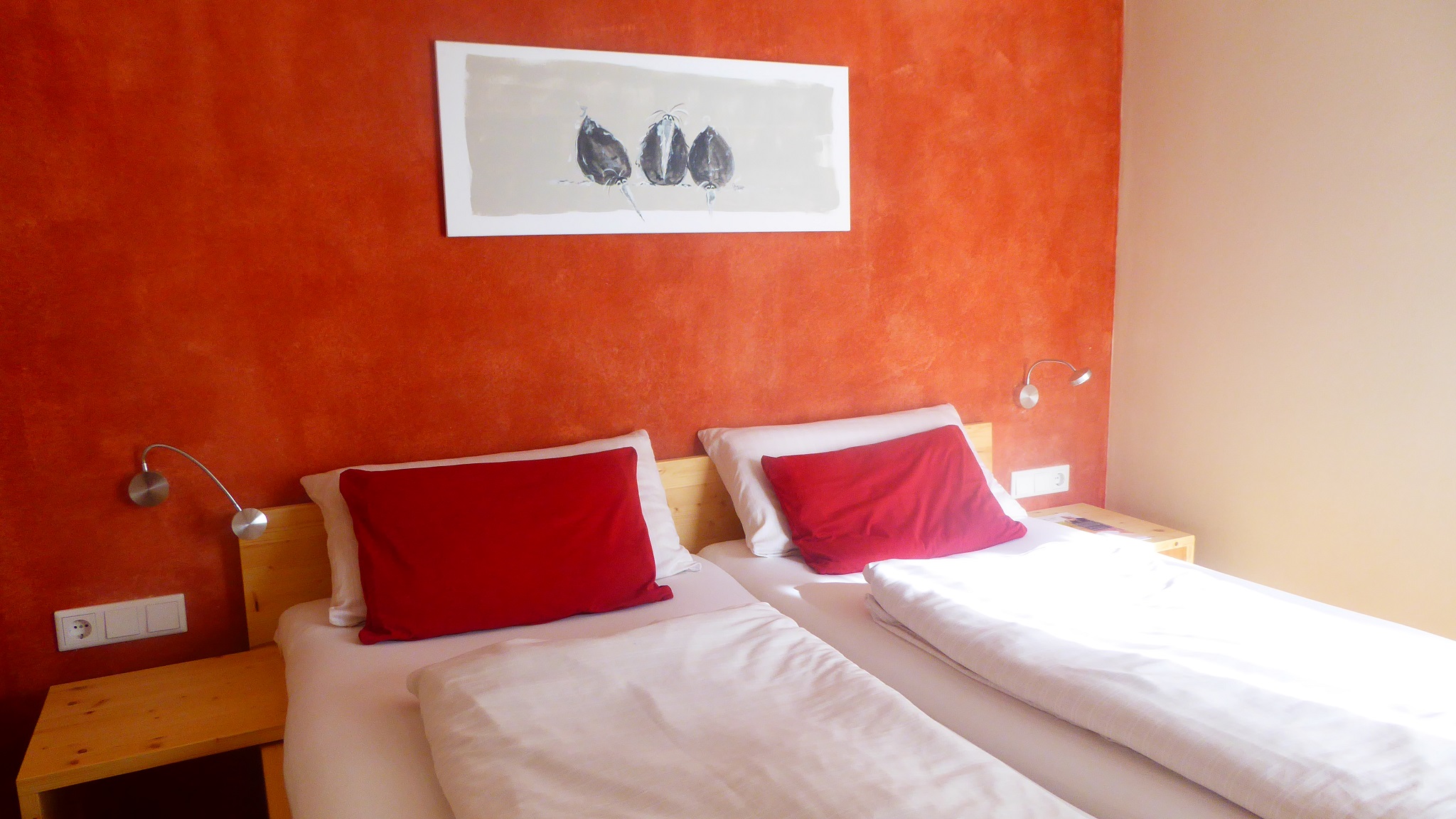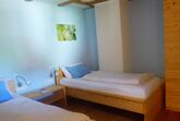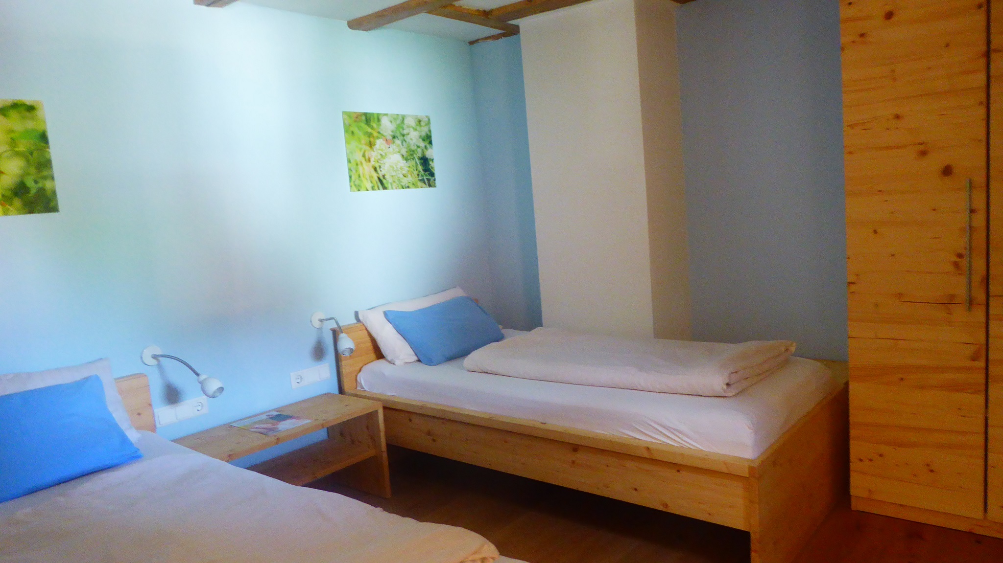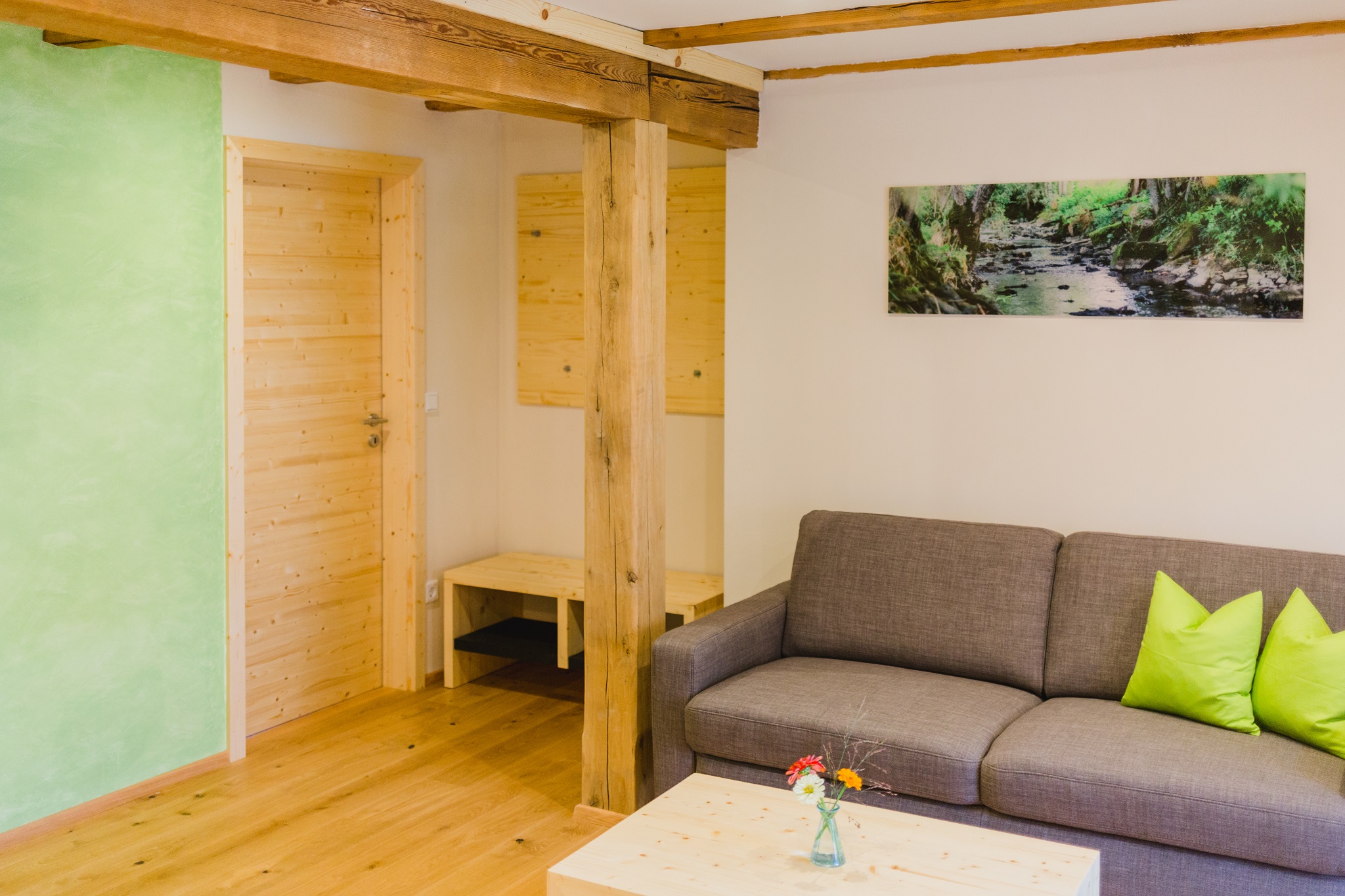 Unsere größte Wohnung befindet sich im 1. Stock des ehemaligen Speichers und besteht aus einem kombinierten Wohn-Ess-Kochbereich sowie 2 Schlafzimmern. Die natürlichen und naturbelassenen Materialien schaffen ein hervorragendes Raumklima. Der Küchenbereich ist mit allem, was das Herz begehrt, ausgestattet. Aus dem großen, gemütlichen, offenen Wohnbereich gelangen Sie in zwei separate Schlafzimmer. Auf dem innenliegenden Balkon oberhalb des Hellbaches können Sie bei einem Schoppen Frankenwein die Abendstimmung genießen und dann im Doppelbett des Schlafzimmers träumen. Im Schlafzimmer in Richtung Hof finden unsere Gäste in zwei Einzelbetten die nötige Ruhe. Das Tageslichtbad mit einer begehbaren Dusche, Waschtisch und WC ausgestattet, lässt viel Platz für Privates.