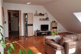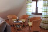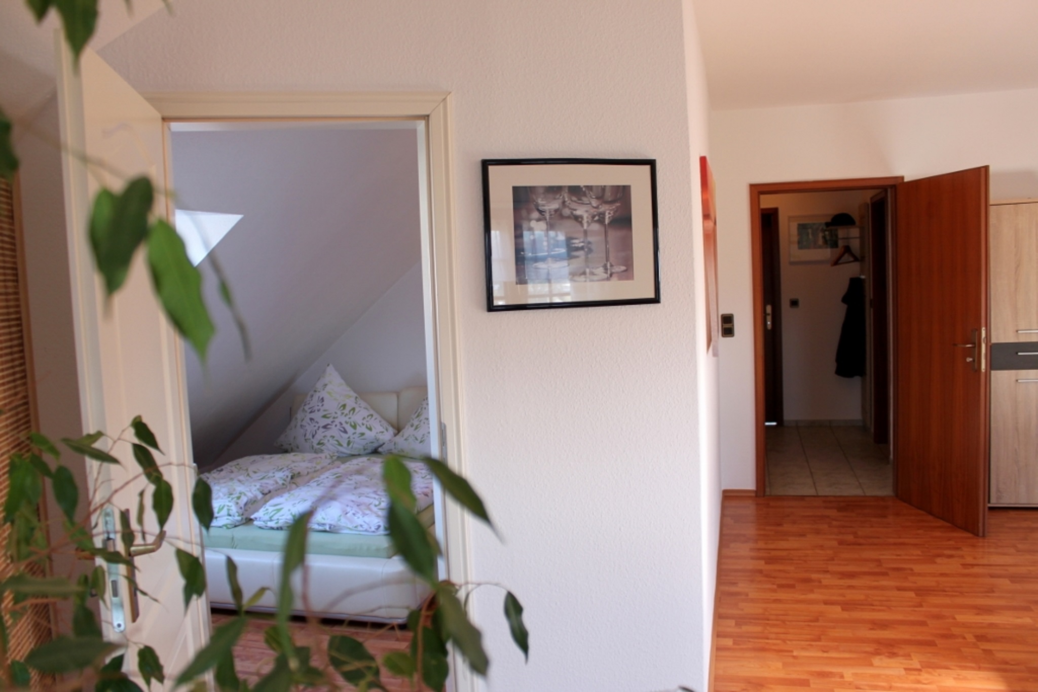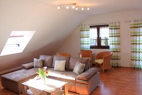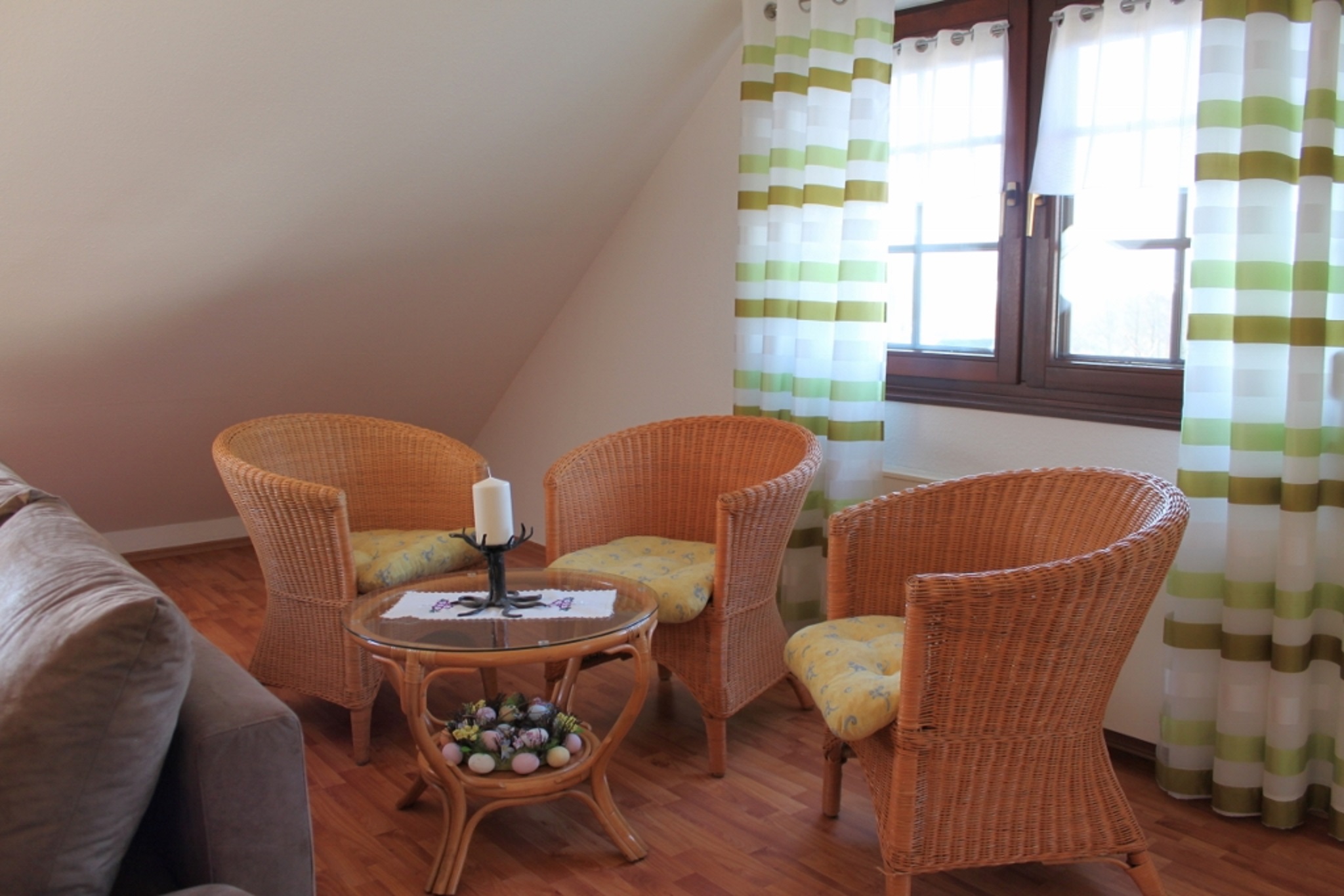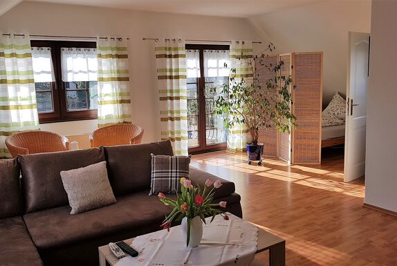 Großer Wohnraum: Couch mit Ottomane, als Schlafcouch ausziehbar (218x118 cm), Couchtisch, Wohnwand, Fernseher (Sat-TV), DVD, Radio (auch CD und USB, MP3), Bücher, 3 Korbsessel mit Tisch, Zugang zum Balkon mit Sitzmöbeln und freiem Blick auf den Waldstein. Weiteres Bett in einer Nische (140x200 cm). Vom Wohnzimmer aus kommt man durch die weiße Türe ins Schlafzimmer.