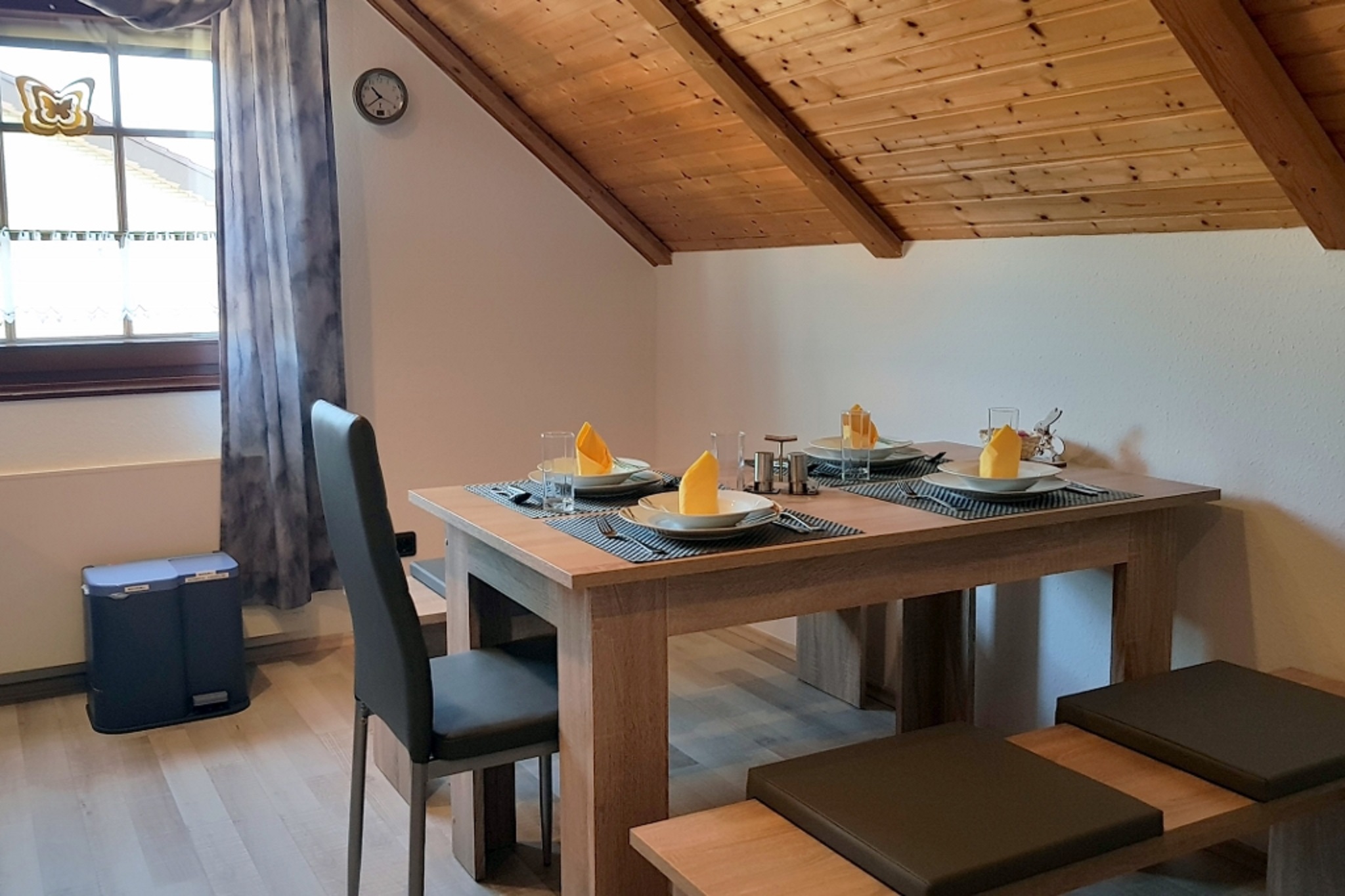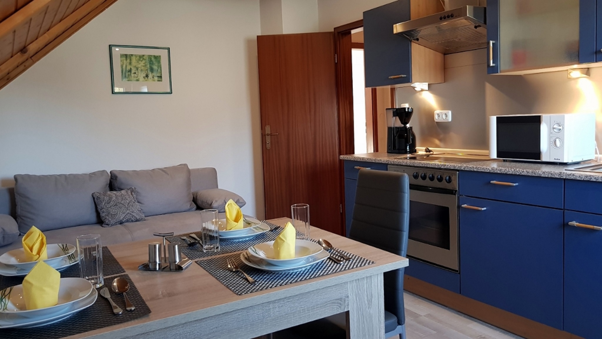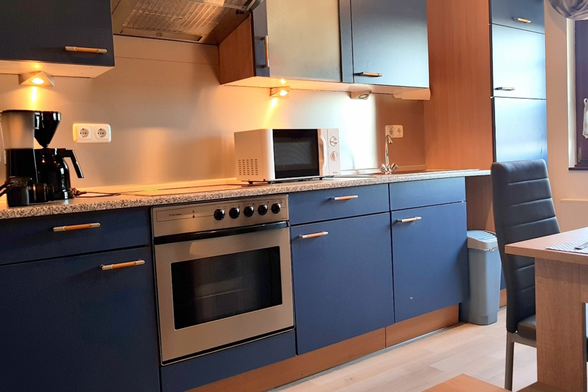 Voll eingerichtete Küche mit Essplatz und Couch: Elektroherd mit Ceranfeld und Backröhre, Dunstabzug, Mikrowelle, Toaster, Kühl/Gefrierschrank, Kaffeemaschine, Wasserkocher, Geschirr, auch für Mikrowelle, Töpfe und Pfanne. Gängigste Gewürze vorhanden. Die Couch kann als Schlafcouch (bis 145x200 cm) genutzt werden.