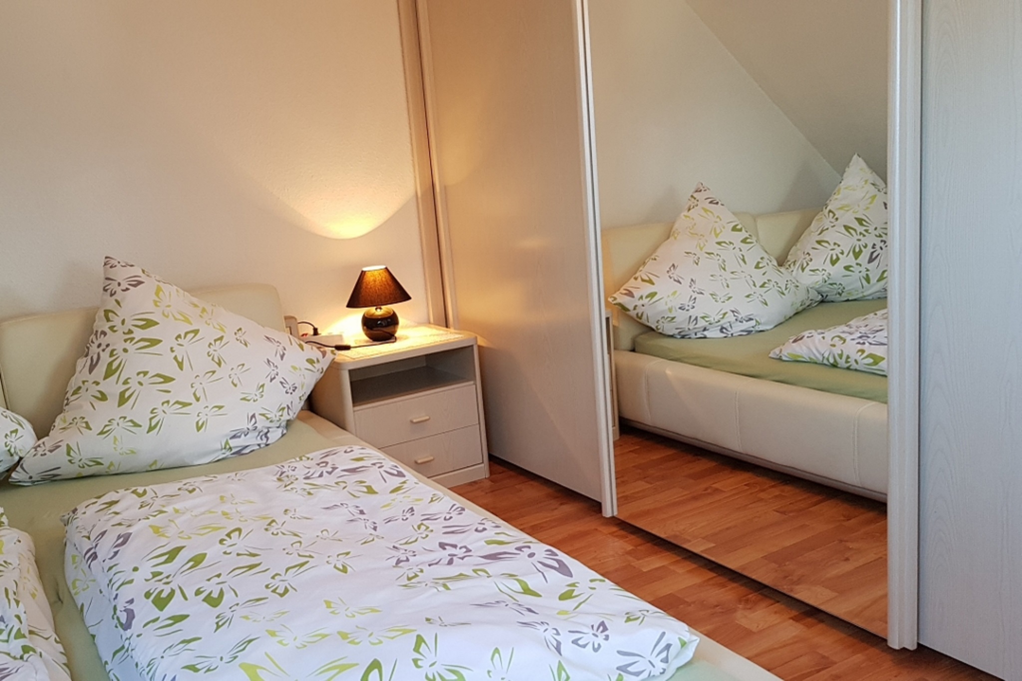 Schlafraum: mit Doppelbett (160x200cm), 3 m Schwebetürenschrank Mitteltüre Spiegel, Nachtschränkchen mit 2 Schüben und Ablage und eine Kommode mit 5 Schüben.