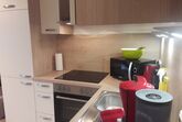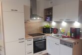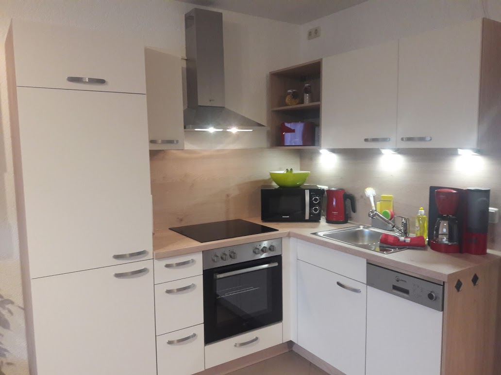 Die hochwertige Küche mit Backofen, Mikrowelle, Cerankochfeld, Geschirrspüler, Kühlschrank mit Gefrierfach und natürlich ausreichend Geschirr und Gläsern, Kaffeemaschine, Wasserkocher und Toaster ausgestattet.