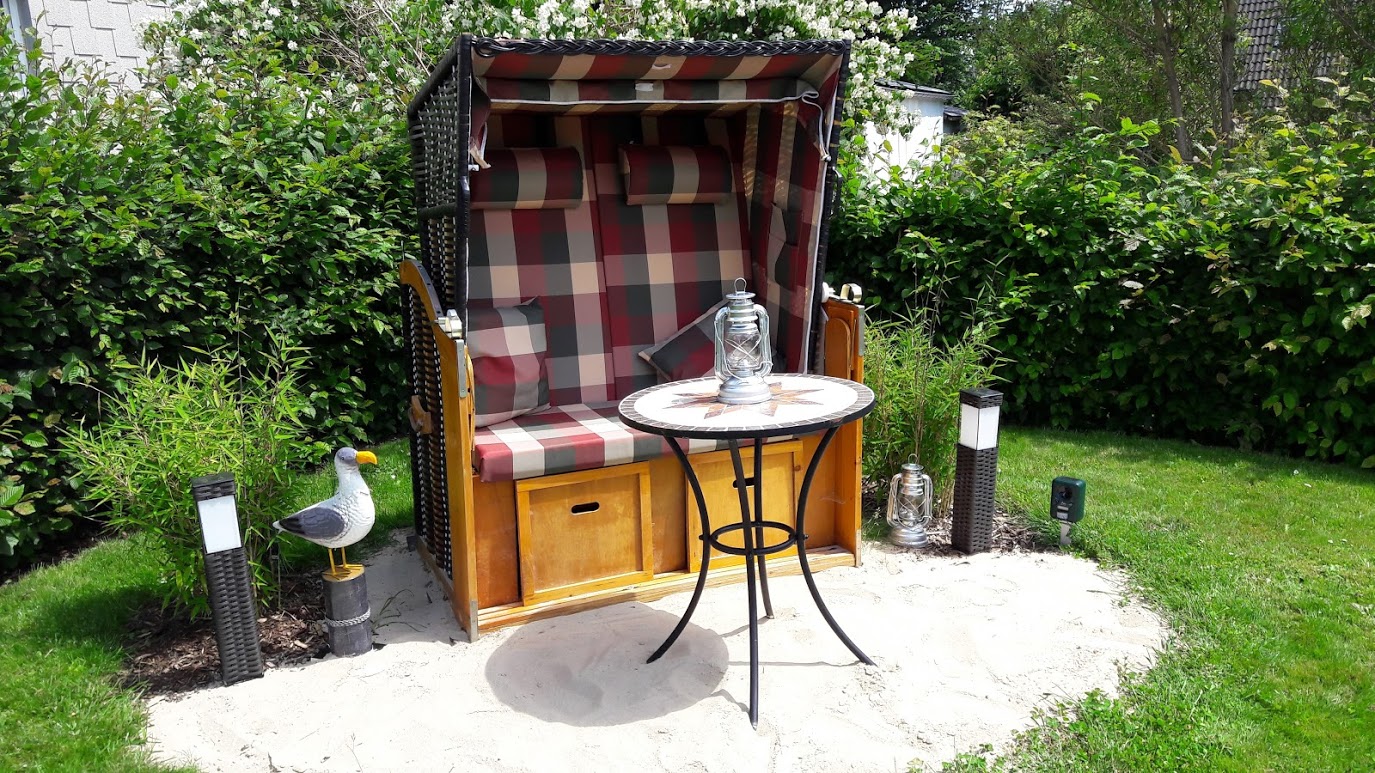 Der Garten mit Liegen und Strandkorb darf gerne mitbenutzt werden.