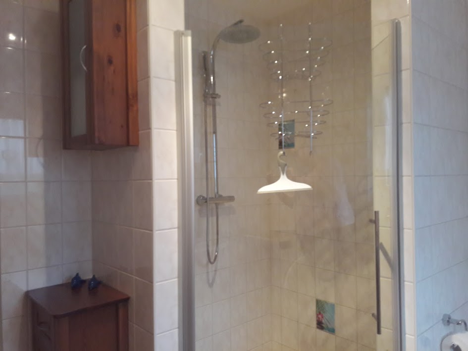 Zur Wohnung gehört weiterhin ein Schlafzimmer mit Doppelbett und großem Schrank und ein modernes Duschbad mit barrierefreier Regendusche und Waschmaschine.