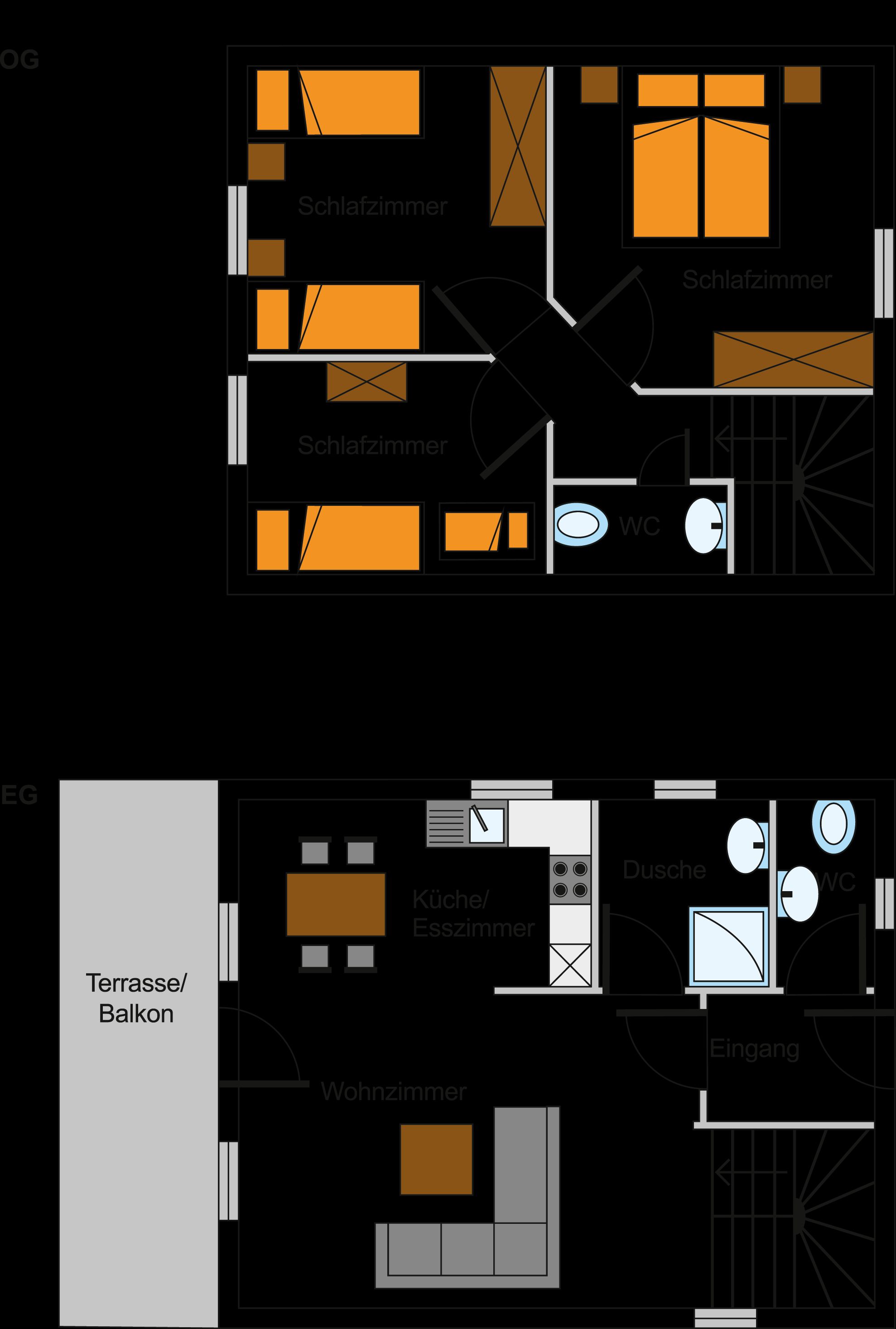 Das schöne, moderne Ferienhaus B ist für 5 Personen ausgelegt. Sie wohnen auf 2 Ebenen. Im Erdgeschoss befindet sich die Küche mit Backofen, Herd, Geschirrspüler, Kaffeemaschine und Wasserkocher. Außerdem befindet sich dort ein Esstisch. Das schöne Wohnzimmer mit SAT-TV und großer Couch lädt zum Verweilen ein. Das Ferienhaus verfügt im Erdgeschoss über eine Dusche und ein separates WC. Im Dachgeschoss befinden sich zwei Schlafräume. Im ersten Schlafzimmer befindet sich ein bequemes Doppelbett. Im zweiten Schlafzimmer stehen zwei Einzelbetten. Im Spielzimmer befindet sich ein Kinderbett. Außerdem befindet sich auf dem Stockwerk ein weiteres WC. Auf dem schönen Balkon und der Terrasse können Sie die Sonne genießen.