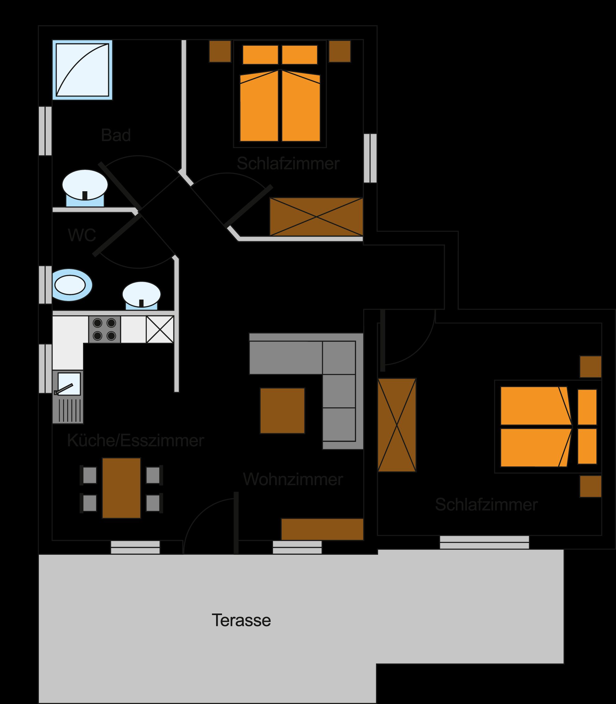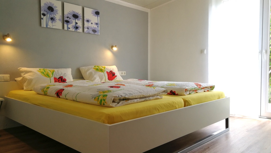 Die moderne Ferienwohnung 4 ist 70 qm groß und für 4 Personen ausgelegt. Die Ferienwohnung verfügt über Küche mit Wasserkocher, Mikrowelle, Kaffeemaschine, Toaster, Kühl-Gefrier-Kombination, Spülmaschine, Kaminofen und Esstisch. Der Wohnbereich mit Couch und SAT-TV lädt zum Verweilen ein. Zum Schlafen gibt es zwei Schlafzimmer mit Doppelbetten. In einem davon gibt es zusätzlich noch ein Gitterbett. Das Badezimmer ist mit Dusche und Waschplatz ausgestattet.Separates WC. Auf der schönen Terrasse können Sie die Sonne genießen. Bettwäsche und Handtücher sind inklusive und auch Waschmaschine und Trockner sind vorhanden. Haustiere dürfen allerdings nicht mitgebracht werden.