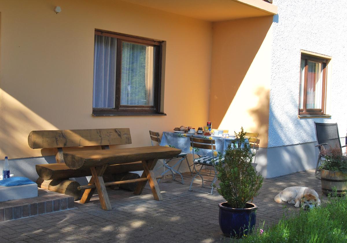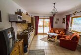 Die Ferienwohnung liegt im Erdgeschoss und bietet auf 70 Quadratmetern Platz für bis zu 5 Personen. Der offene Wohn- und Essbereich verfügt über Sofa, Flachbildfernseher, Sideboard, Essecke mit Eckbank und Küchenzeile. Die Küchenzeile ist mit Kühlschrank, Geschirrspülmaschine, Elektroherd, Mikrowelle, Kaffeemaschine und Wasserkocher voll ausgestattet. Von der Wohnküche aus haben Sie Zugang auf die Terrasse mit Sitzgelegenheiten und Grillplatz. Die gemütliche Sitzecke lädt zum Frühstücken oder Verweilen ein. Die Ferienwohnung verfügt über zwei Schlafzimmer mit je einem Doppelbett. In einem der Schlafzimmer kann ein Zustellbett als fünfte Schlafmöglichkeit aufgestellt werden. Das Badezimmer verfügt über Dusche, Waschbecken, WC und Fön.