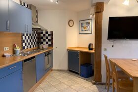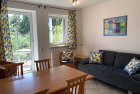 Der kombinierte Wohn- und Essraum. Das gemütliche Wohnzimmer mit Couch, einem kleinen Tisch mit zwei Stühlen, einem modernem SAT-TV sowie mit einem Esstisch ausgestattet. Die vollausgestattete, Küche mit Backofen, Herd, Geschirrspüler, Kühlschrank.Außerdem gehört zu der Ferienwohnung eine Süd-West Terrasse mit Blick in die freie Natur.