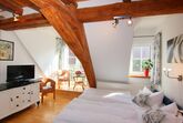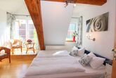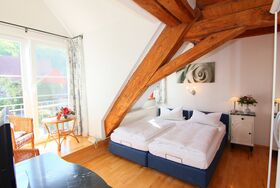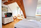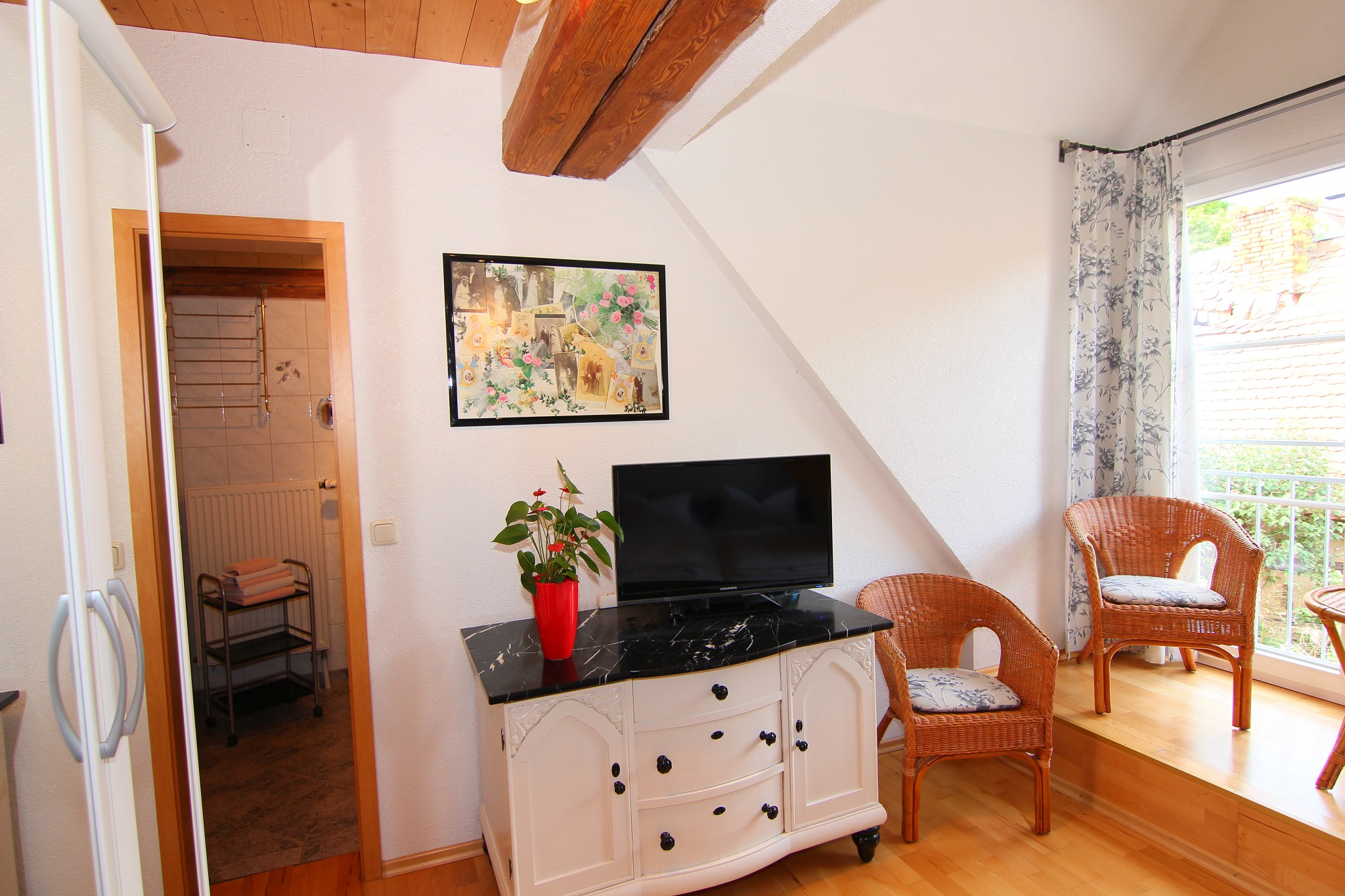Das liebevoll eingerichtete und geräumige Doppelzimmer Romantik ist eine Einzimmerwohnung. Im gemütlichen und lichtdurchfluteten Wohn- und Schlafraum ist ein bequemes Doppelbett, ein moderner SAT-TV sowie zwei Sessel und ein kleiner Tisch vor dem Fenster. Außerdem gibt es kostenloses WLAN und einen Safe.