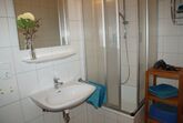 Toilettenraum mit Dusche, Waschbecken und WC. Große Hochterrasse.
