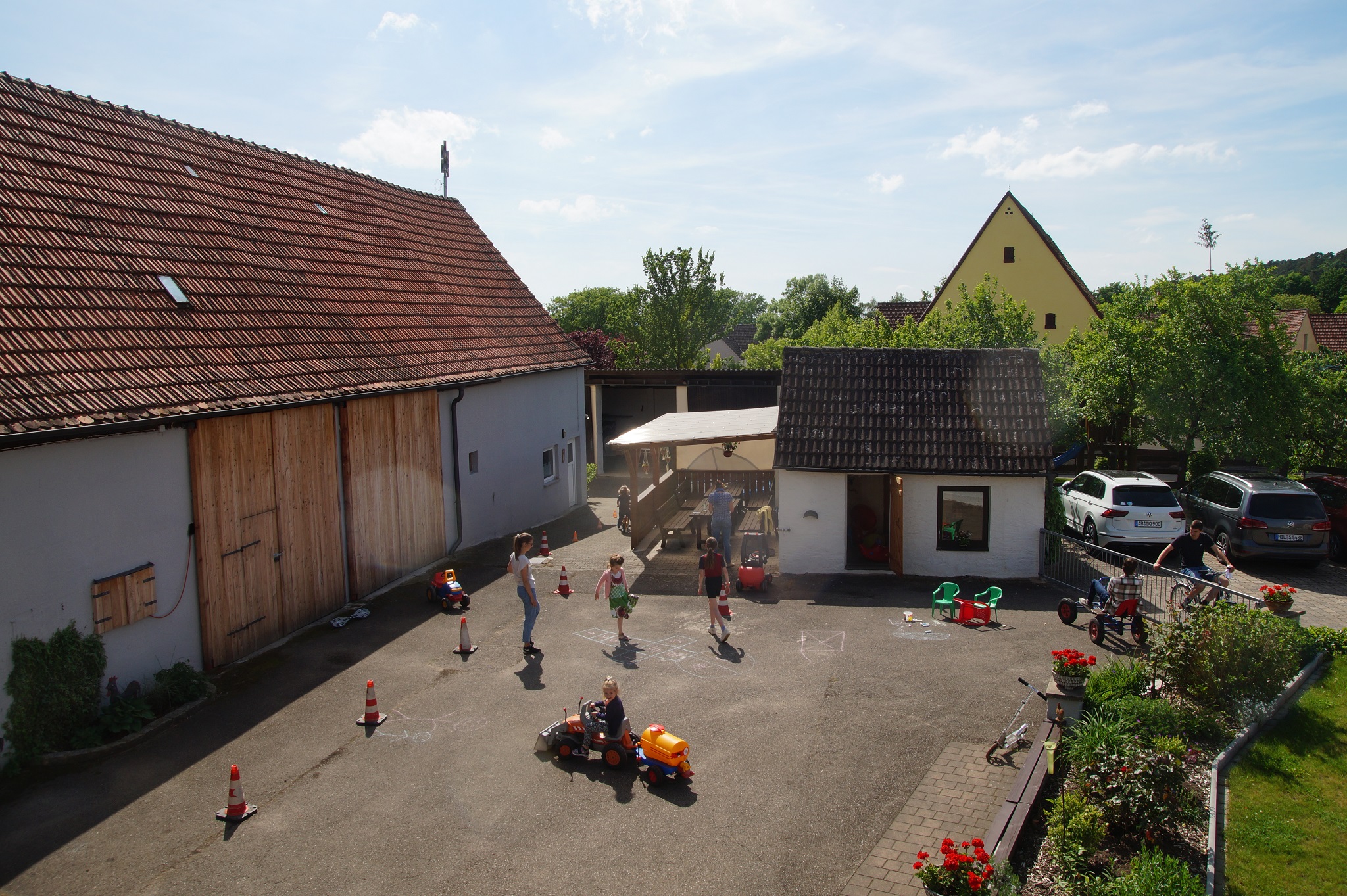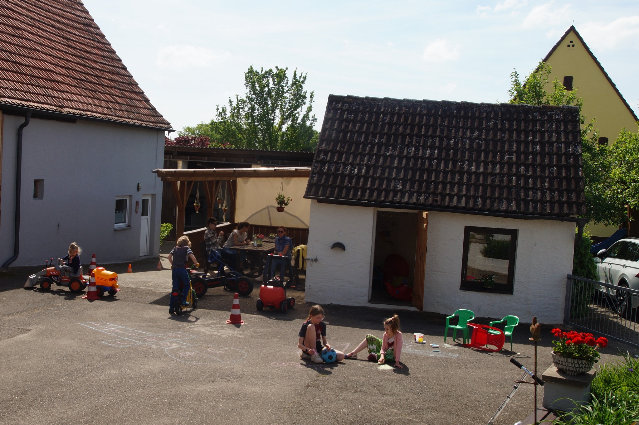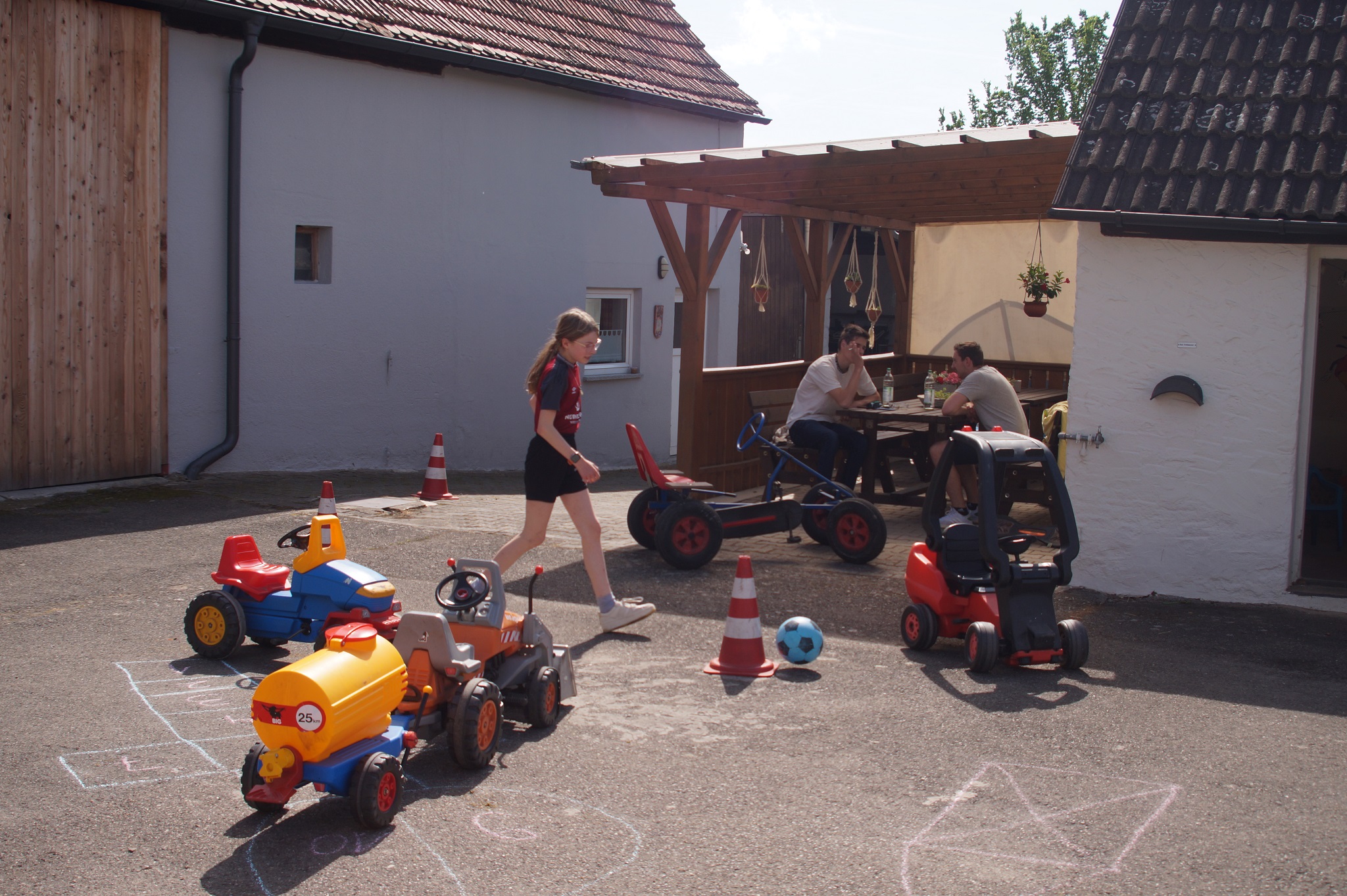 abgeschlossenen Hof und auf dem Spielplatz nach Lust und Laune toben. Verschiedene Tret-Fahrzeuge und viele Spielsachen stehen dazu bereit.