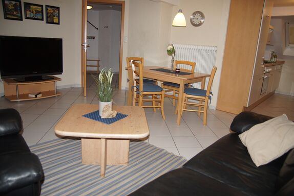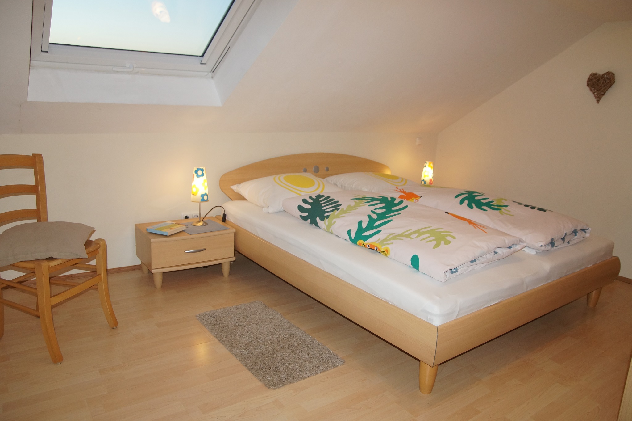 Dachgeschoss, 78qm, 2 Schlafzimmer mit je einem Doppelbett. Große Wohnküche mit Küchenzeile (Spülmaschine, Mikrowelle), Essplatz und Couchgarnitur. Bad mit Dusche und Waschbecken. WC separat. Balkon.