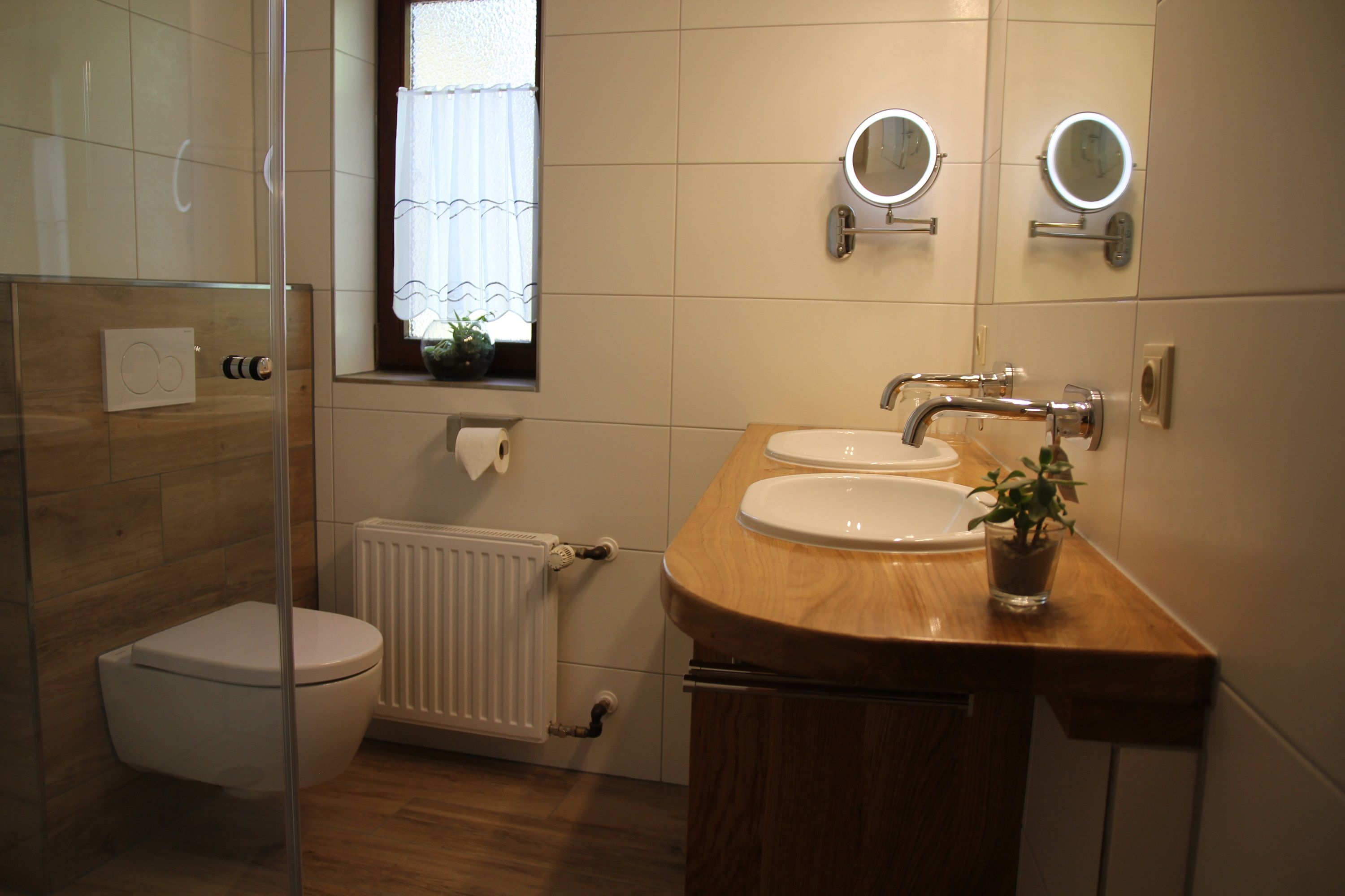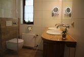Das Bad ist mit Dusche, WC und Doppelwaschbecken ausgestattet.